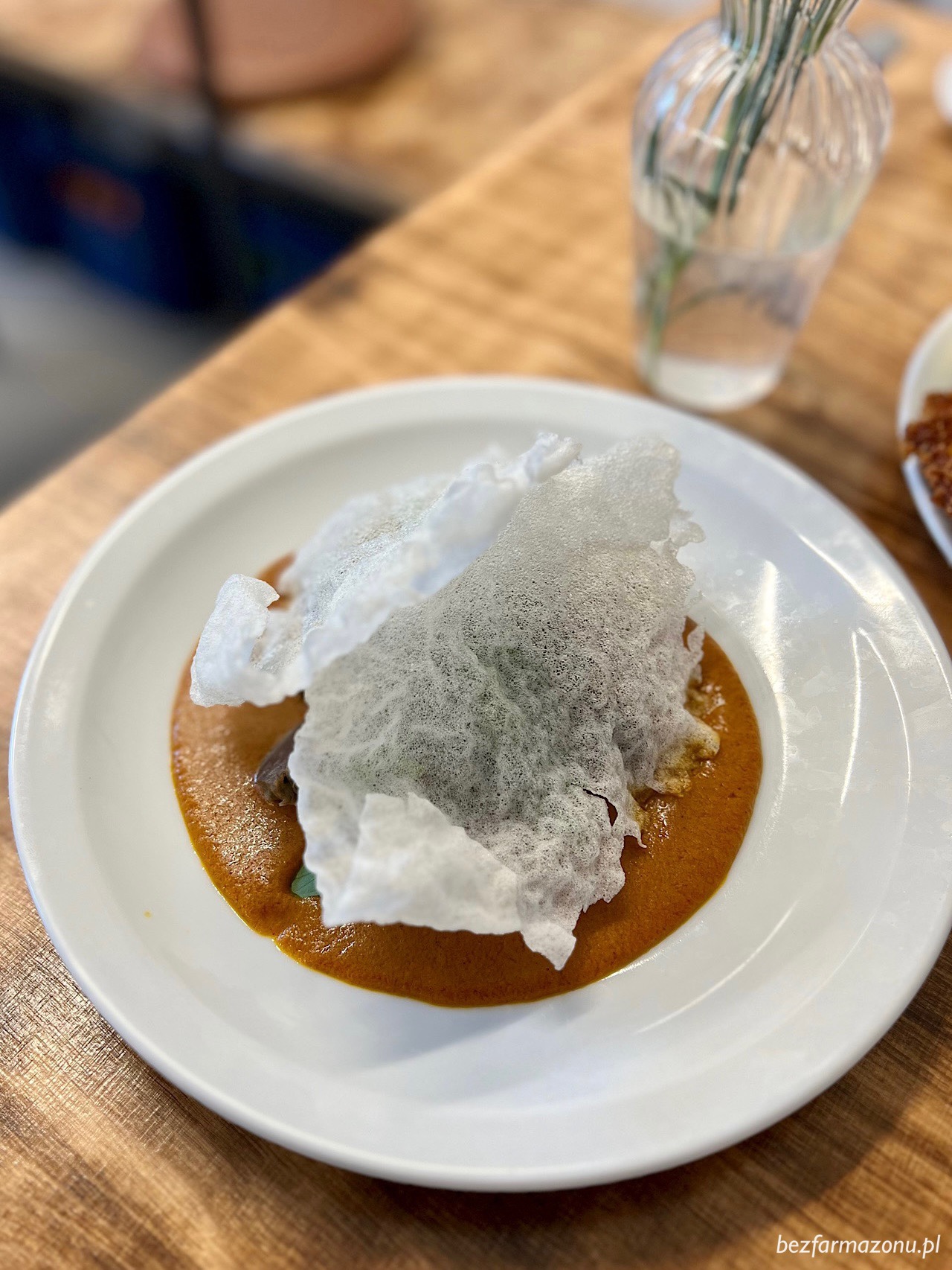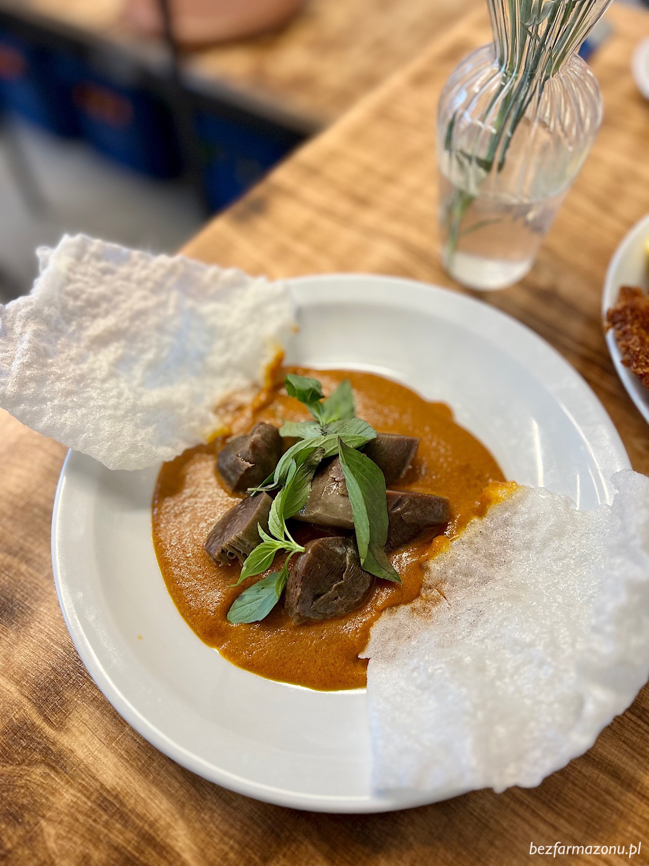 Miękkie, bogate w żelazo, lecz bez tego specyficznego posmaku. Gęsty pomidorowo – maślany sos z wyczuwalnymi przyprawami z azjatyckiego kontynentu dobry i odrobinę ostry. Jasne to butter chicken, ale nie każdy z gości musi wiedzieć, iż czeka go coś hot – przydałoby się jakieś mini oznaczenie papryczki w karcie. Chips ryżowy to miły wizualny bajer.