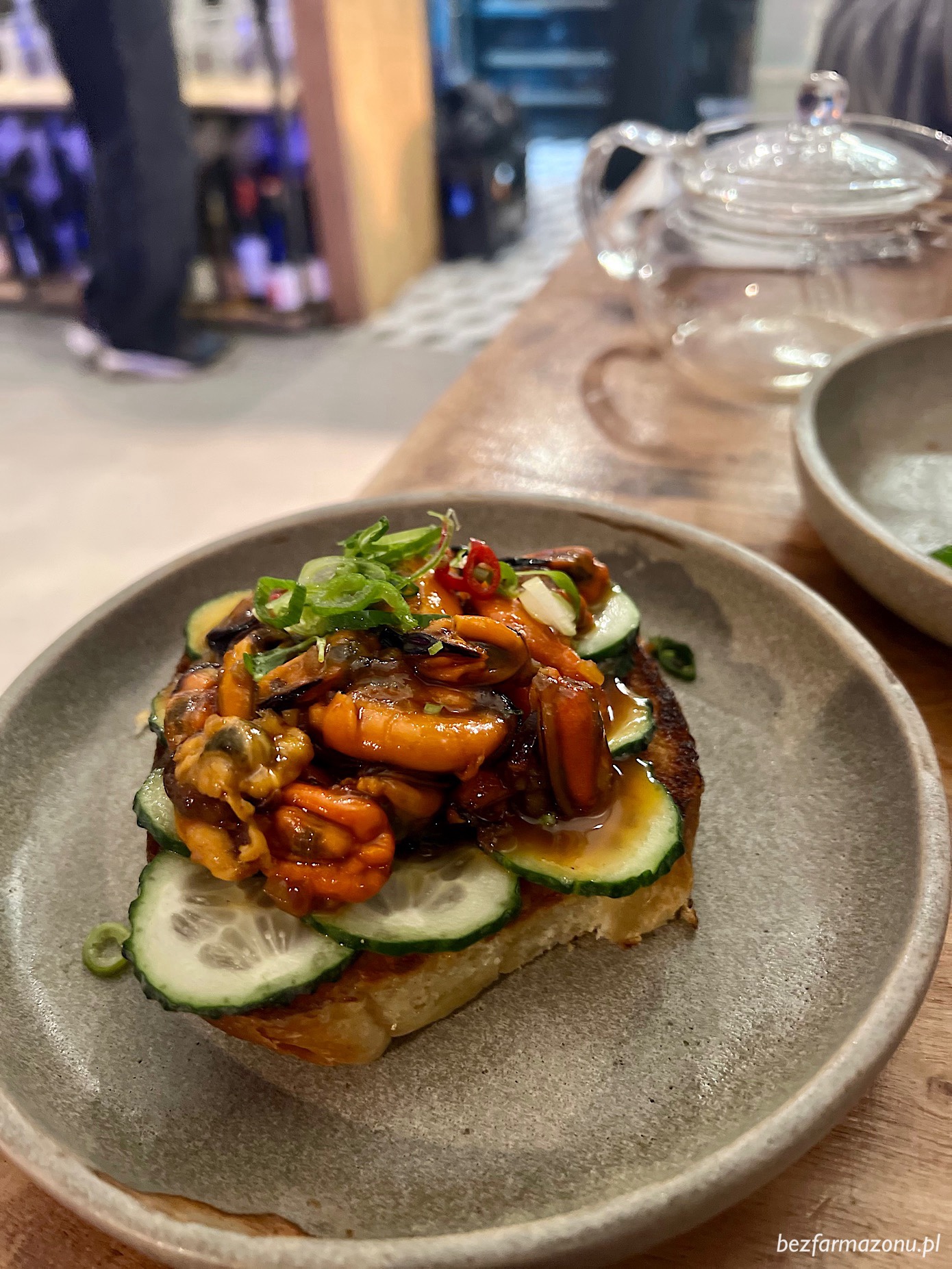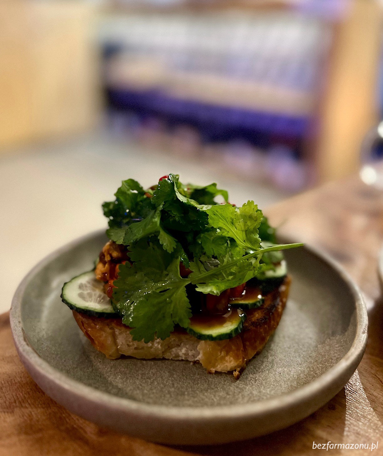 Spotkanie zakończył świetny podgrzany tost na chlebie hokkaido ze słodko – kwaśno – pikantym mięsem z muli i azjatycką sałatką z ogórkami (38 PLN).