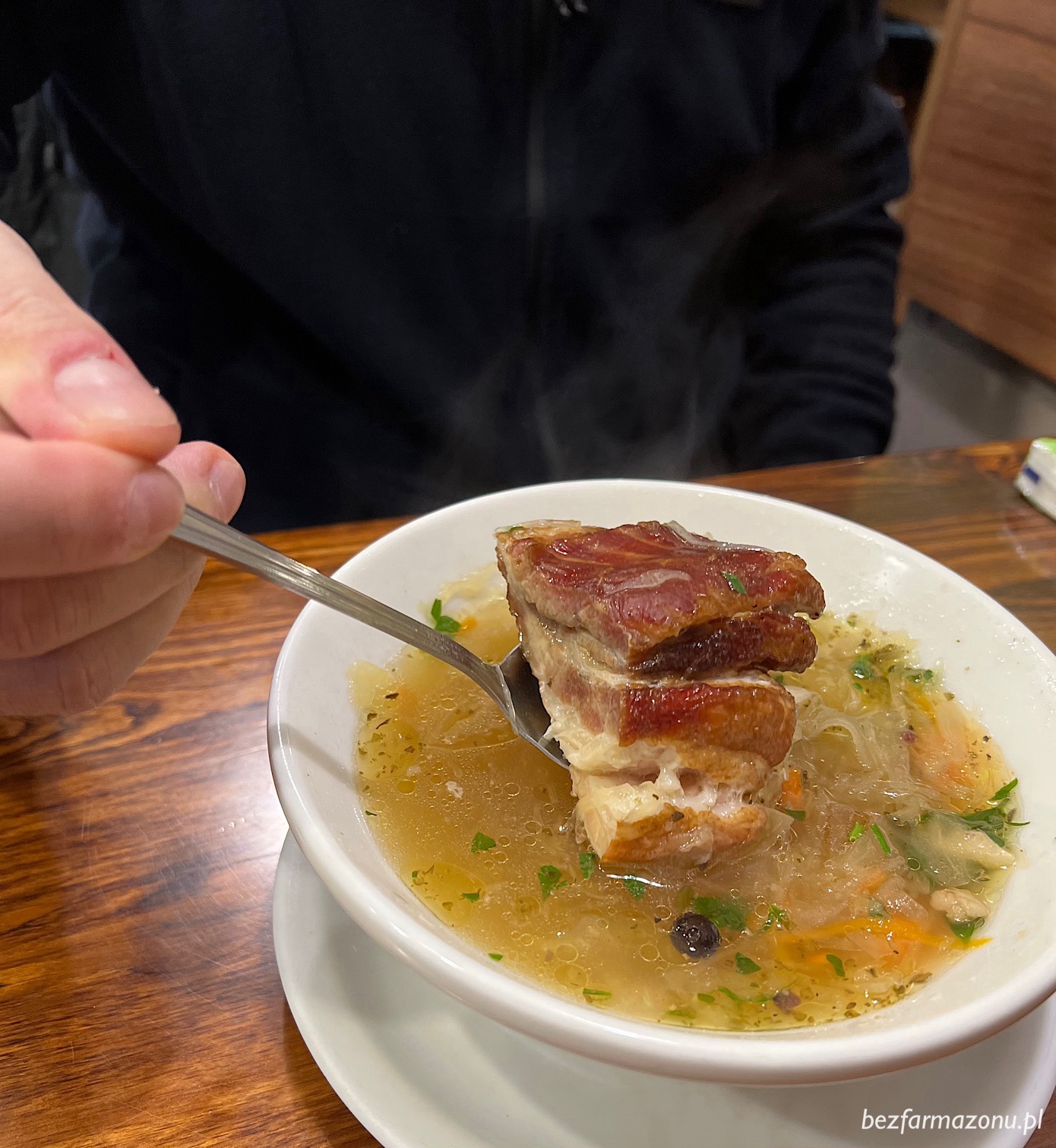 Ale ta zupa! O mamusiu! Gorąca jak diabli, kwaskowata, ale nie do wykrzywienia twarzy. Przez obecność ogromnego kawała boczku tłustawa i charakterna. Bardzo, bardzo dobra.