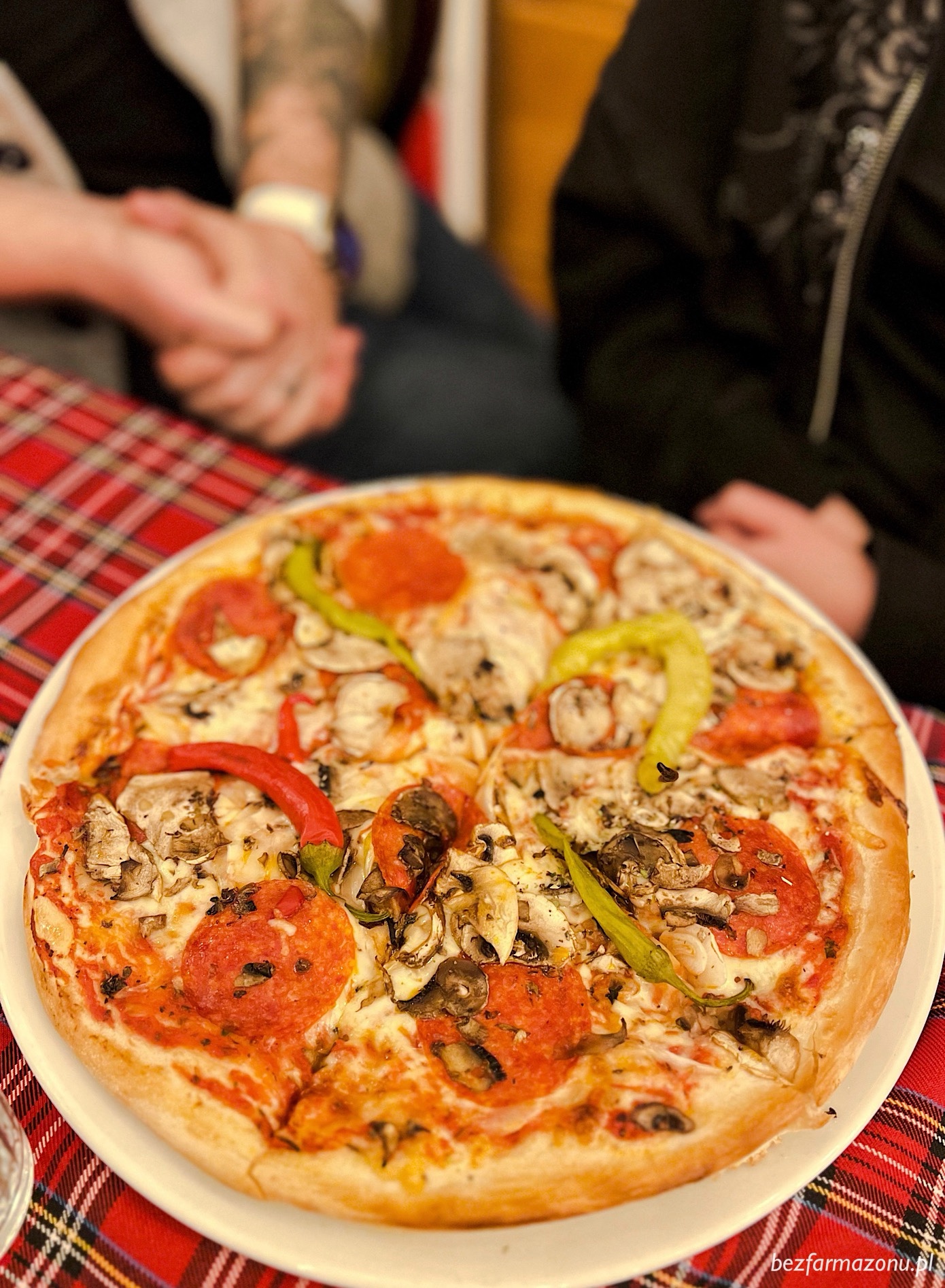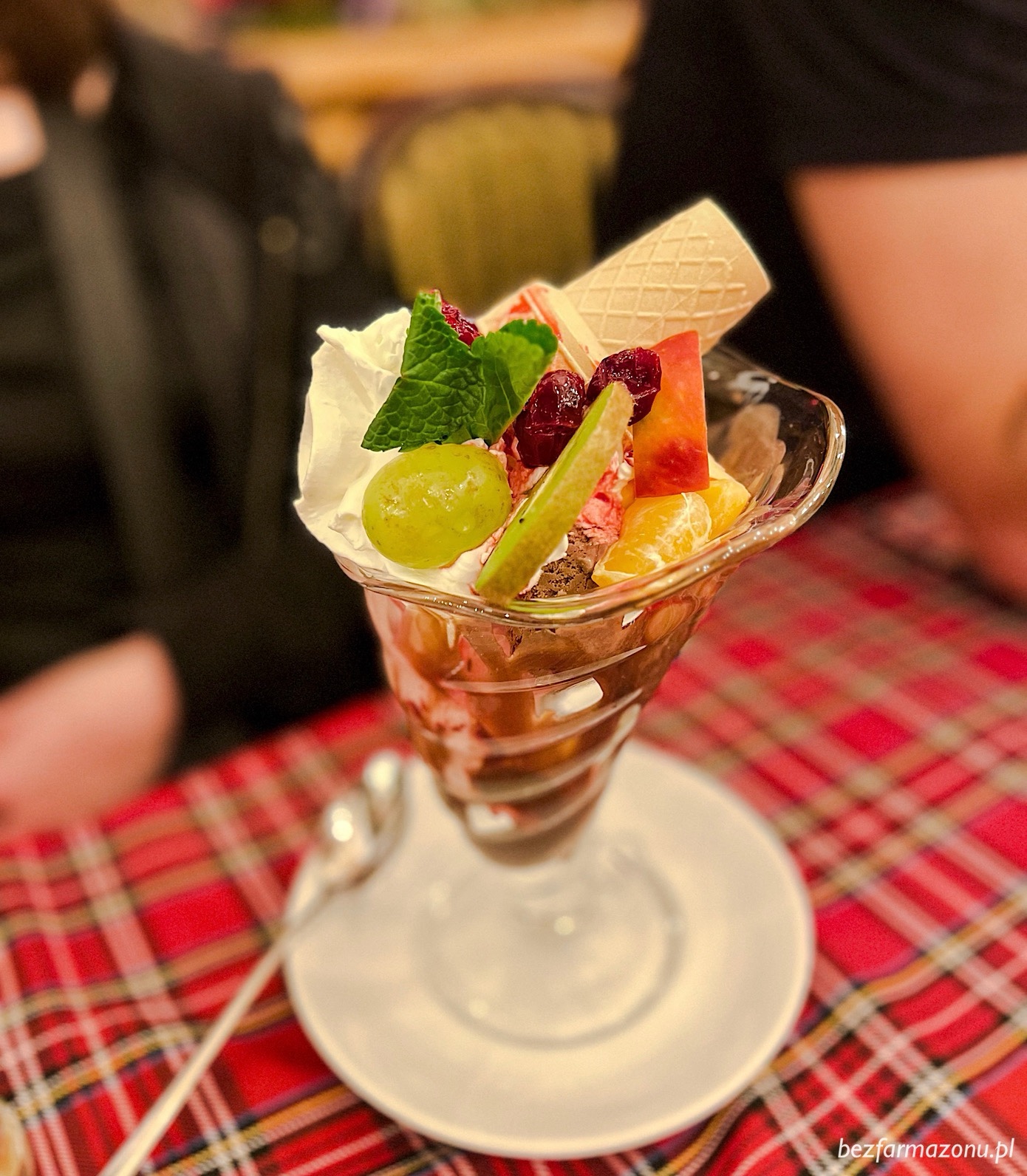 Spróbowała takiej powiedziałbym oldschoolowej pizzy z pieczarkami, papryką i salami, a później swe kubki smakowe radowała lodowym pucharem z owocami i bitą śmietaną (20 PLN).
