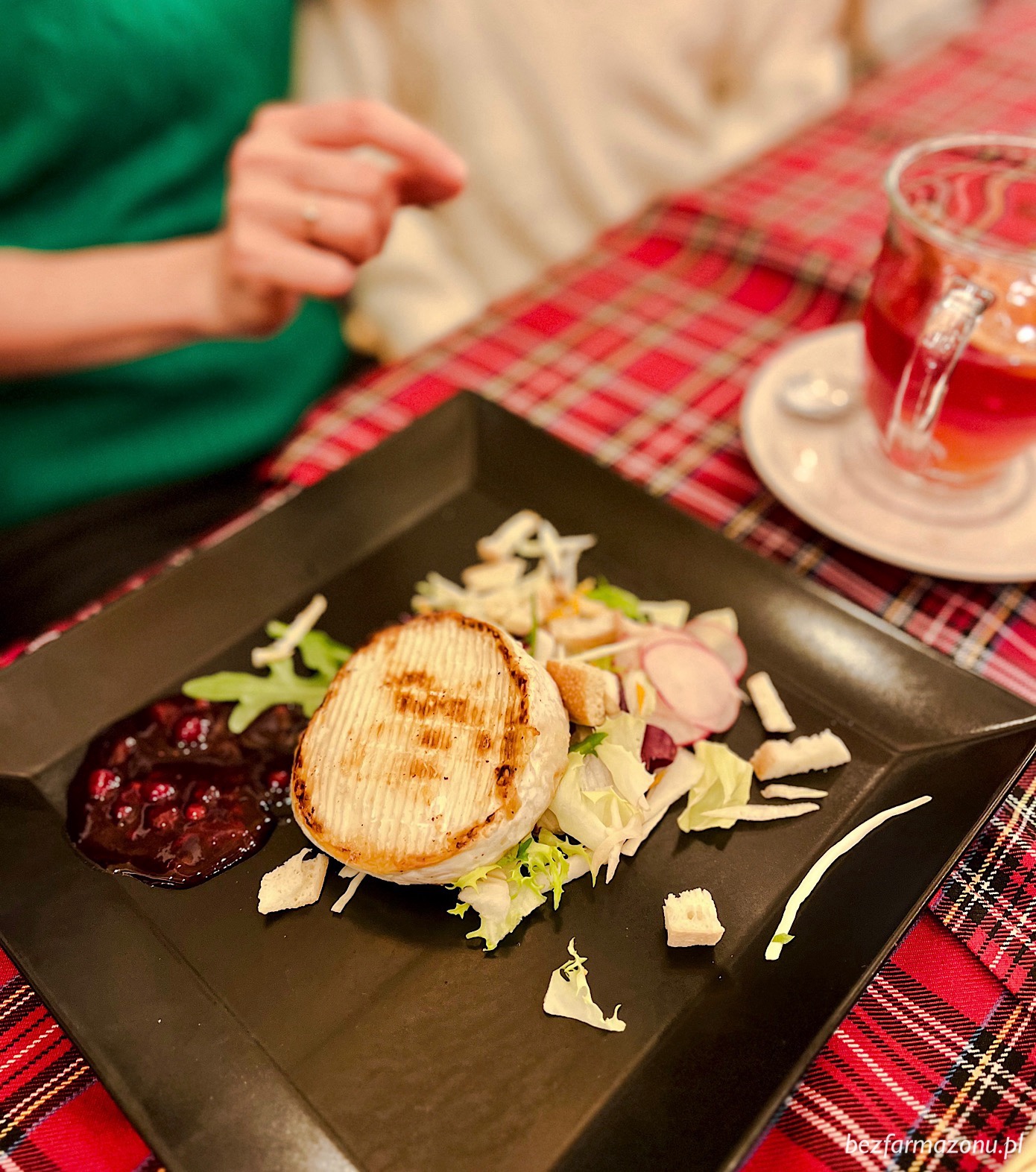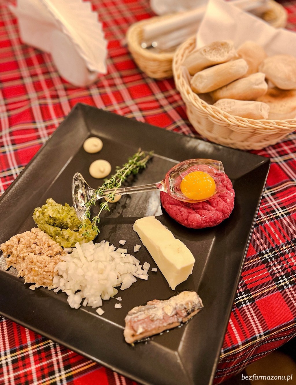Najklasyczniejszy z klasycznych tatar z żółtkiem w kieliszku (34 PLN), grillowany camembert na sklepowym miksie sałat z żurawiną (23 PLN), gorący, pyszny i treściwy żurek z jakiem, kiełbasą i ziemniakami (18 PLN).