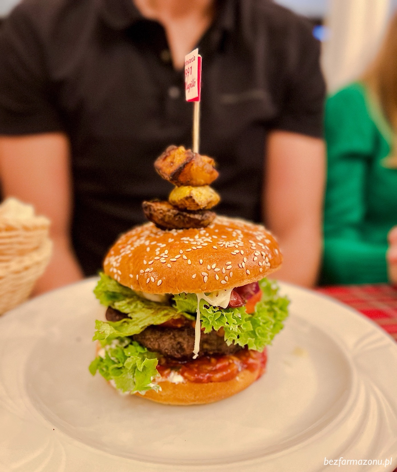 Zamówione przez chłopaków burgery nie prezentowały najwyższych lotów, ale trzeba przyznać, że kucharzom nie brakuje pomysłowości. Podaje się je z nabitymi na drewnianą dzidę kilkoma pieczonymi ziemniaczkami oraz kawałkiem pomarańczy z czarnuszką…