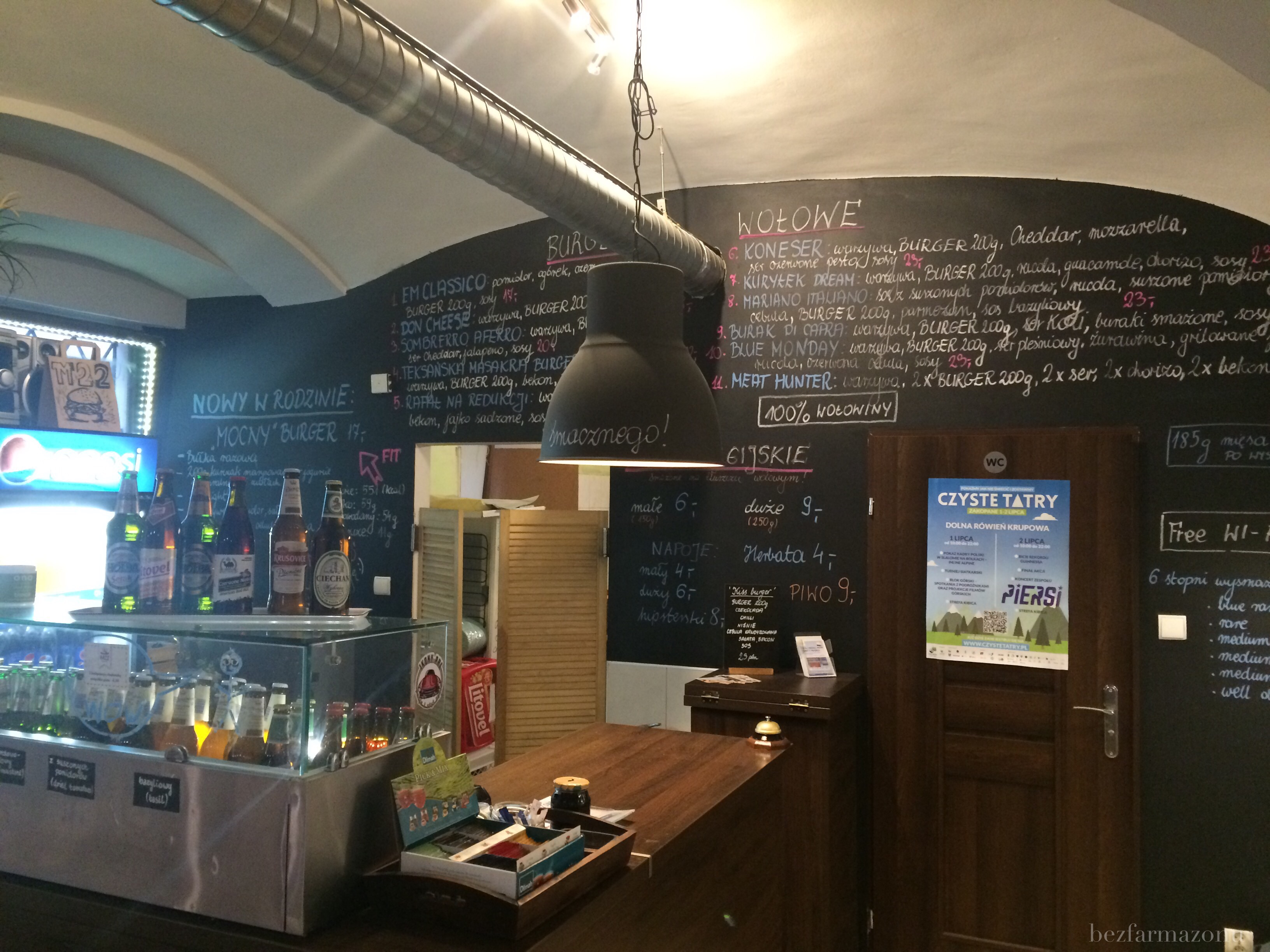 Po wejściu do środka, w oczy rzuciła się ogromna tablica z wypisanym na niej menu. Oprócz wspomnianych burgerów są też frytki belgijskie, piwko i obecnie modne napoje.