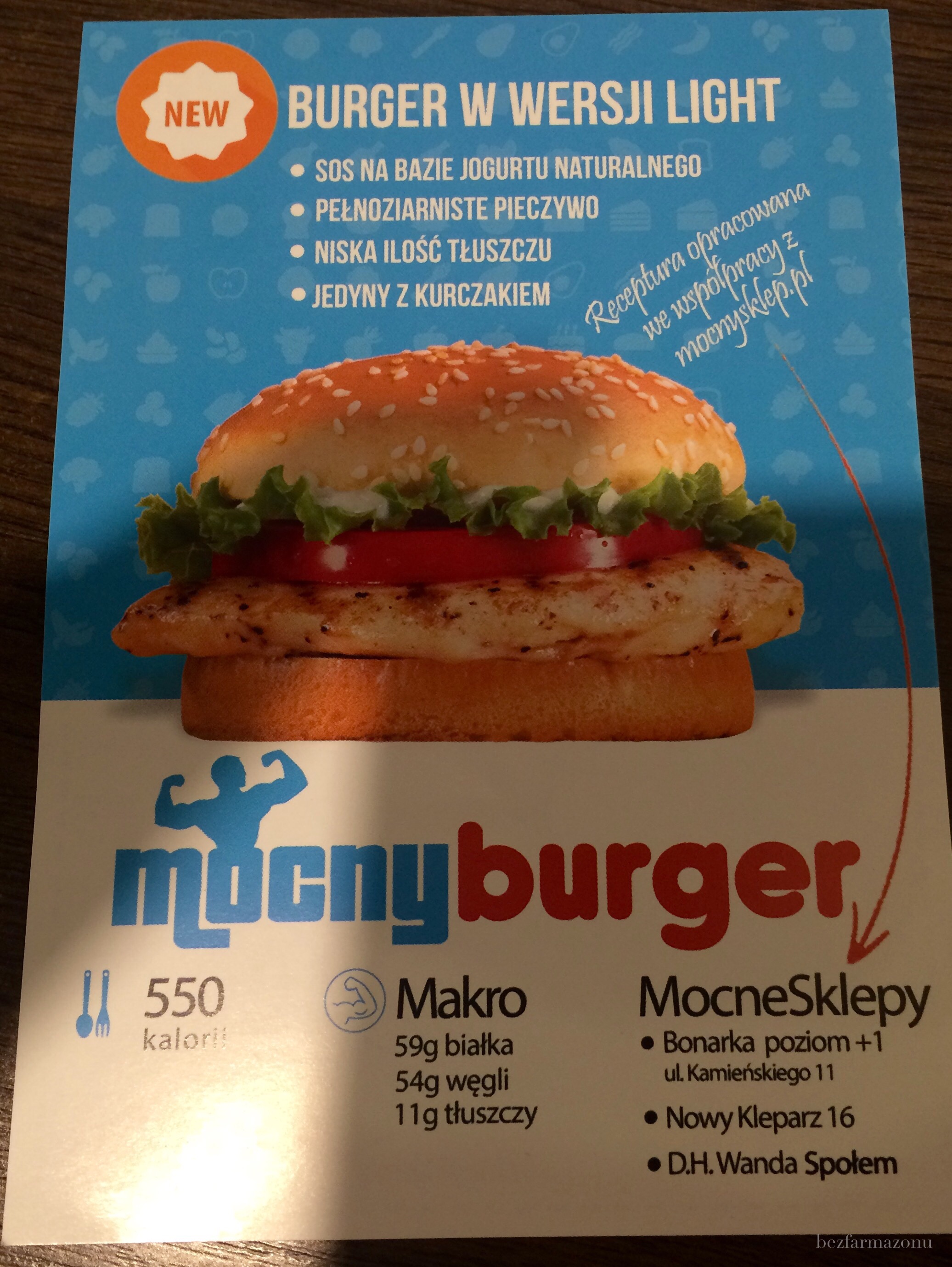 Jest też Mocny Burger. Strzałem w dychę jest fakt wyliczenia całego makro i przedstawienia go na poniższej ulotce. Podziękowania dla Mocnego Sklepu za pomoc w kreowaniu tego dzieła – kawał dobrej roboty !