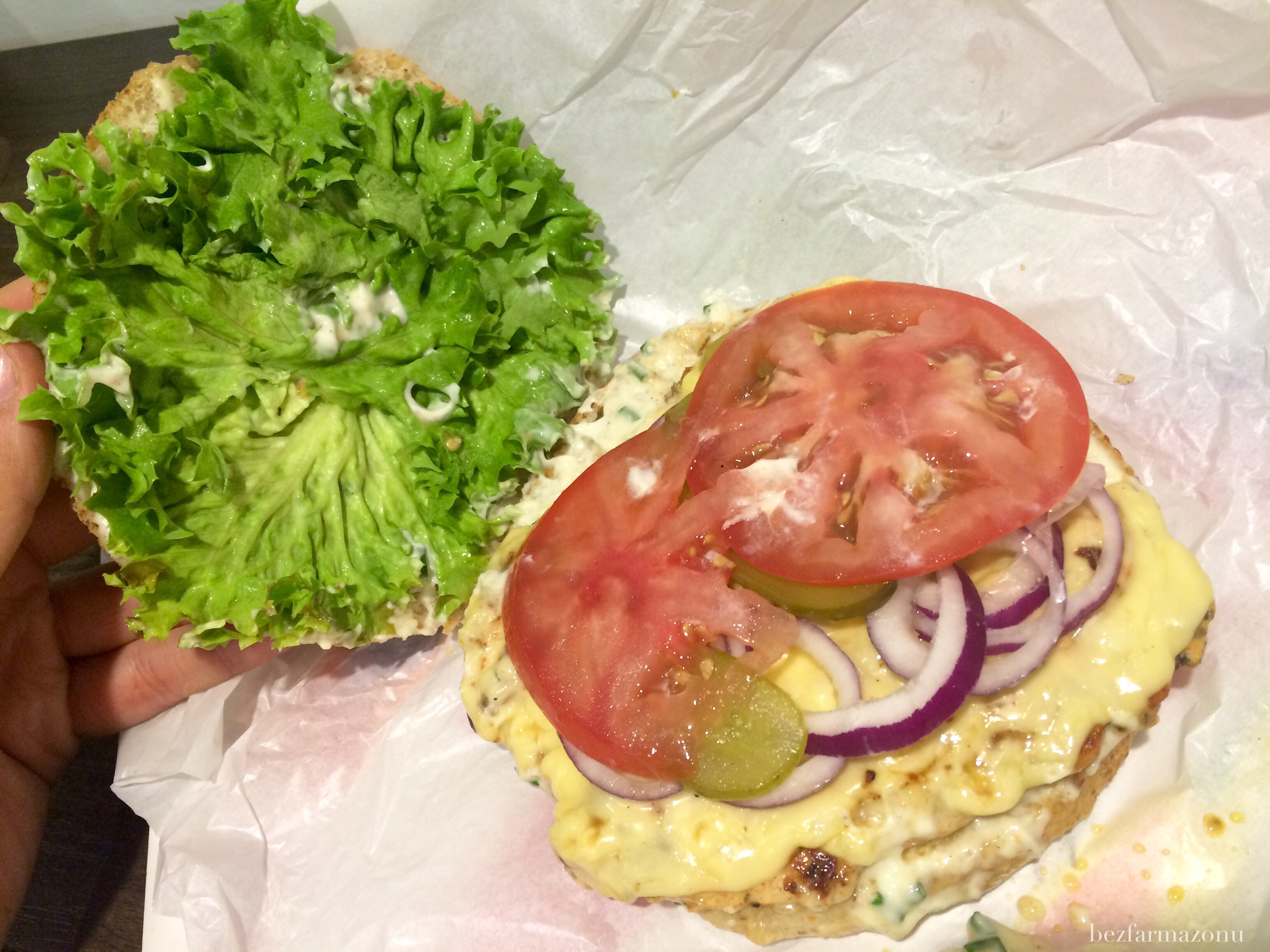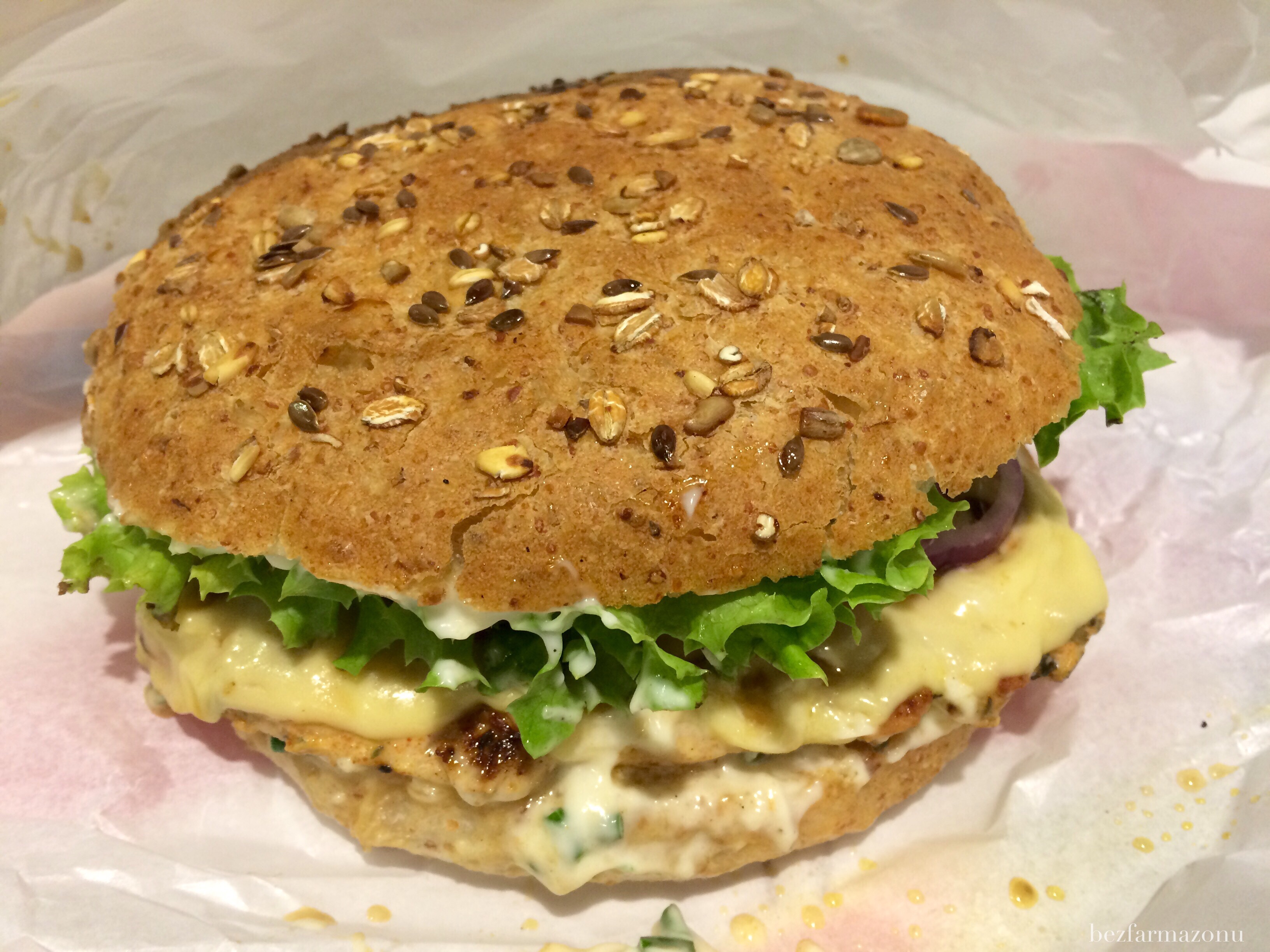 Rozpakowałem z papieru, konkretnie ugryzłem i zakosztowałem raju – tak tak serio, nie przesadzam – fuckin paradise. Już w pierwszym gryzie poczułem wszystkie składniki oraz wysmażone pod zamówienie różowiutkie mięso (może z minimalnie za dużą jak dla mnie ilością pieprzu). Zwróćcie uwagę na tego wesołego pomidora – nie był to jakiś pierwszy lepszy stęchły chłystek, ale prawdziwy mięsisty czerwony warzyw. Czerwona cebula za którą nie przepadam tutaj w ogóle mi nie przeszkadzała, a sprężysty ogór i sałata były świeże i takie jak trzeba. Pyszna, chrupiąca, sezamowa bułka zwieńczała to wołowe cacko.