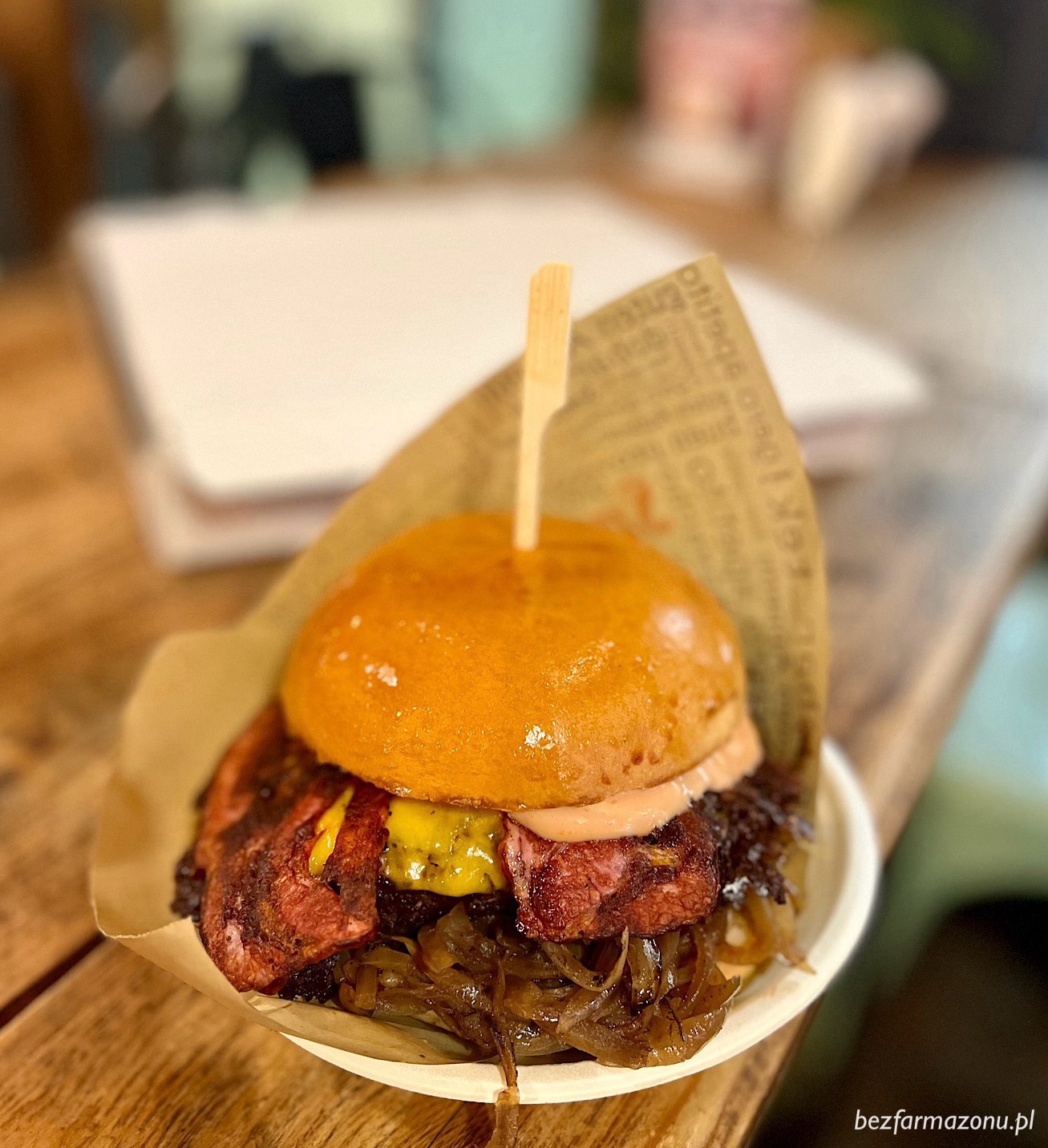 Poprosiłem klasyka (31 PLN) z dodatkowo płatnym bekonem (3 PLN). Byłem jedyny w kolejce, więc już po niecałych dziesięciu minutach otrzymałem takiego oto skubańca.
