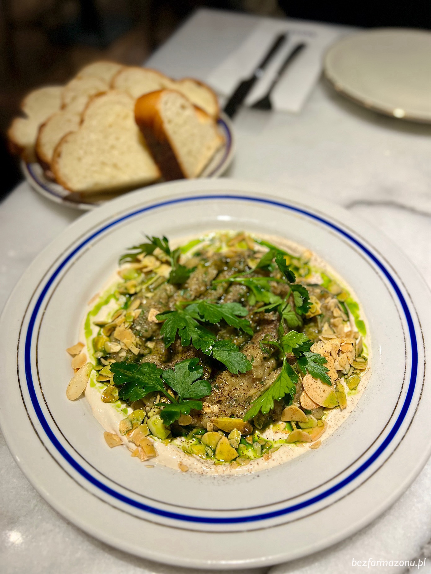 Najpierw rewelacyjny palony bakłażan spoczywający na tahinie z jogurtem wraz z prażonymi migdałami z harissą (36 PLN). Tuż po nim na stół zawitał bardzo trzeba przyznać smaczny i świeży tatar z jelenia z gorczycą z jałowcem, majonezem grzybowym oraz topinamburem (49 PLN).
