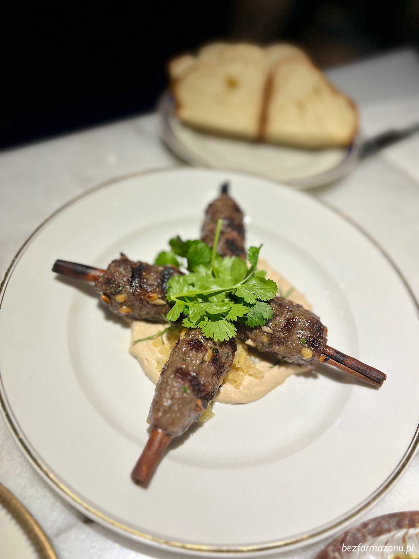 Chwilę później dostarczono pomysłowe i iście wybitne kluski z topinamburu z prażonymi orzechami, pastą paprykową oraz kiszonym topinamburem (36 PLN) oraz nieziemsko pachnące kebaby jagnięce z ukrytymi w środku orzeszkami piniowymi. Cztery kawałki mięsa spoczywały na laskach cynamonu oraz tahinie z kiszoną cytryną (48 PLN) Zestawienie bez dwóch zdań pomysłowe – w moje gusta trafiło idealnie.