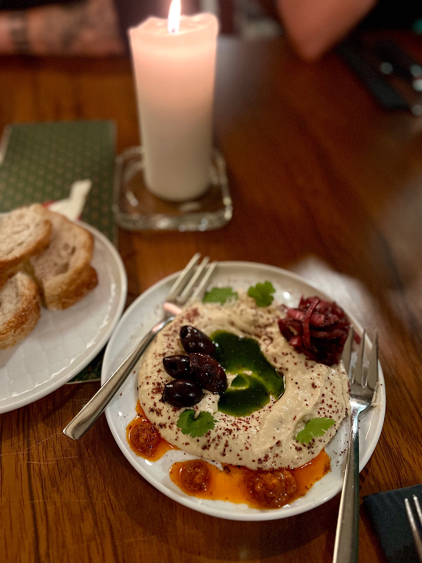 Na początek pojawił się prezent od kuchni mianowicie hummus ze świeżym pieczywem. Chwilę później stół zaczęły wypełniać przystawki.