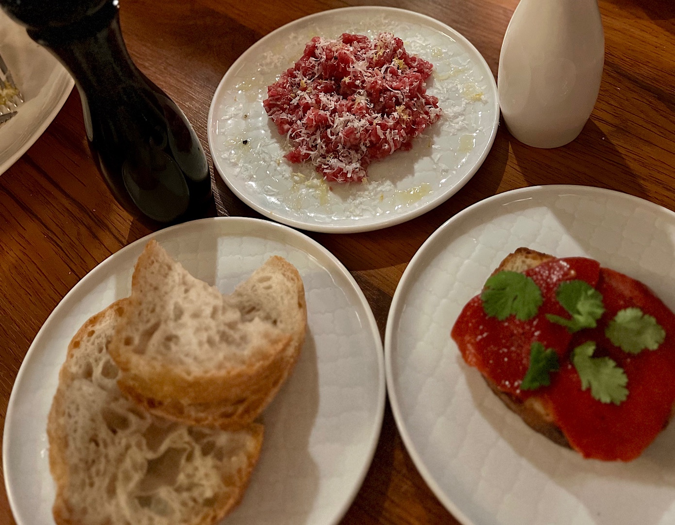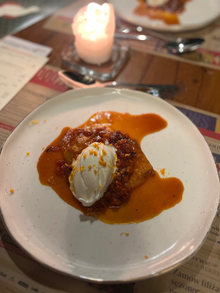 Fenomenalne krokiety z kaczką (26 PLN), uczciwy tatar wołowy z konfitowanym czosnkiem i parmezanem (52 PLN) oraz mięciutki wieprzowy policzek z kiszoną kapustą, śmietaną i suszonymi grzybami (29 PLN).