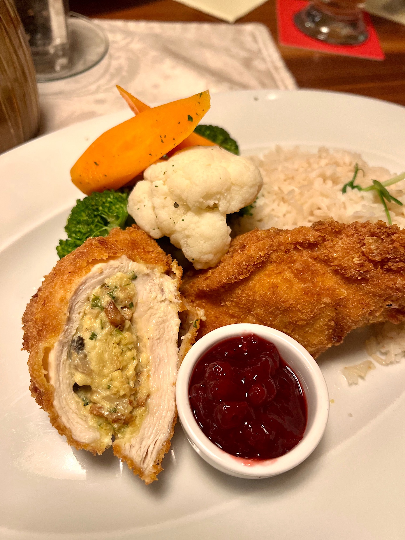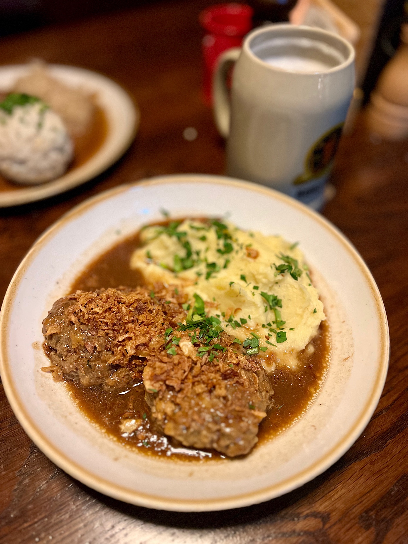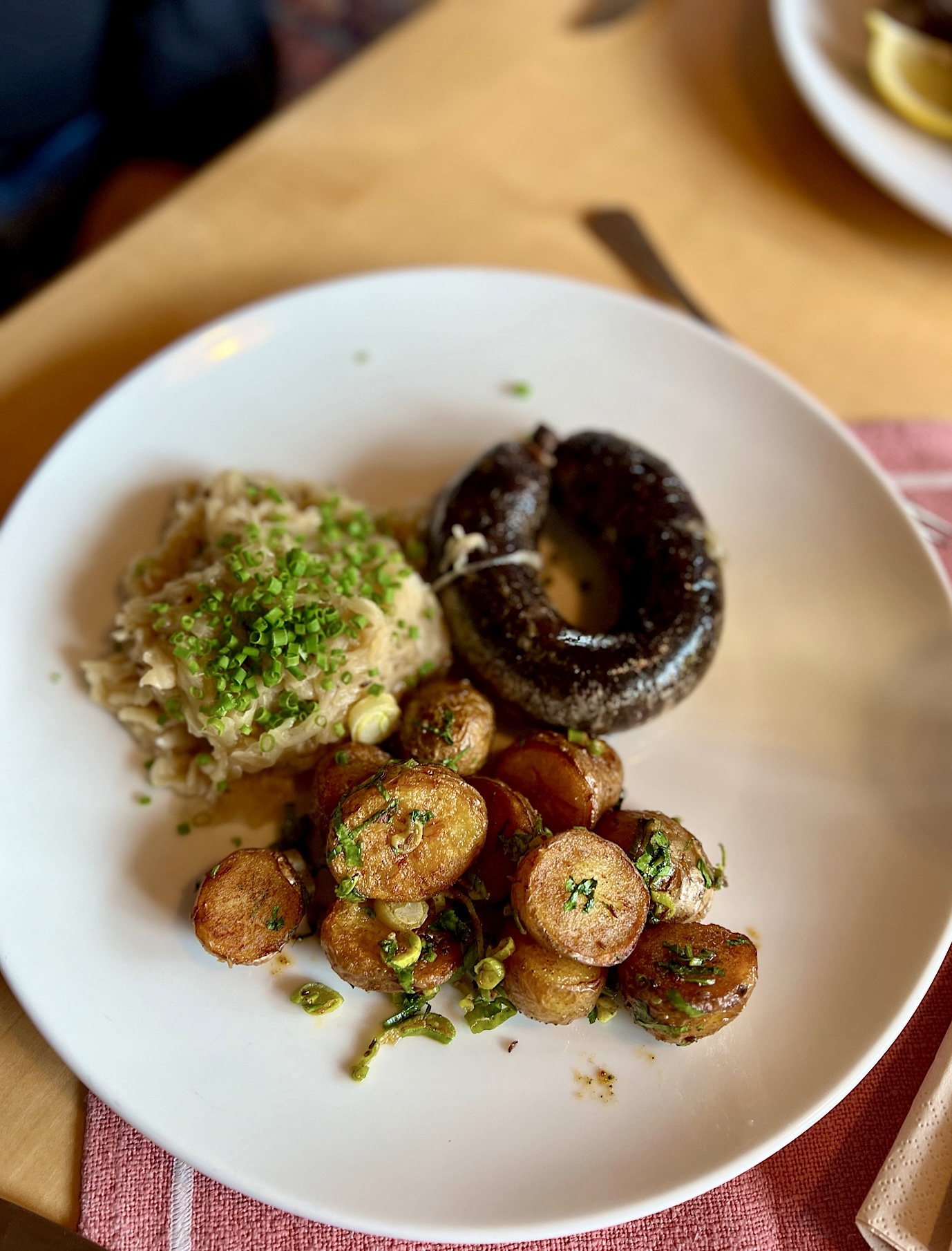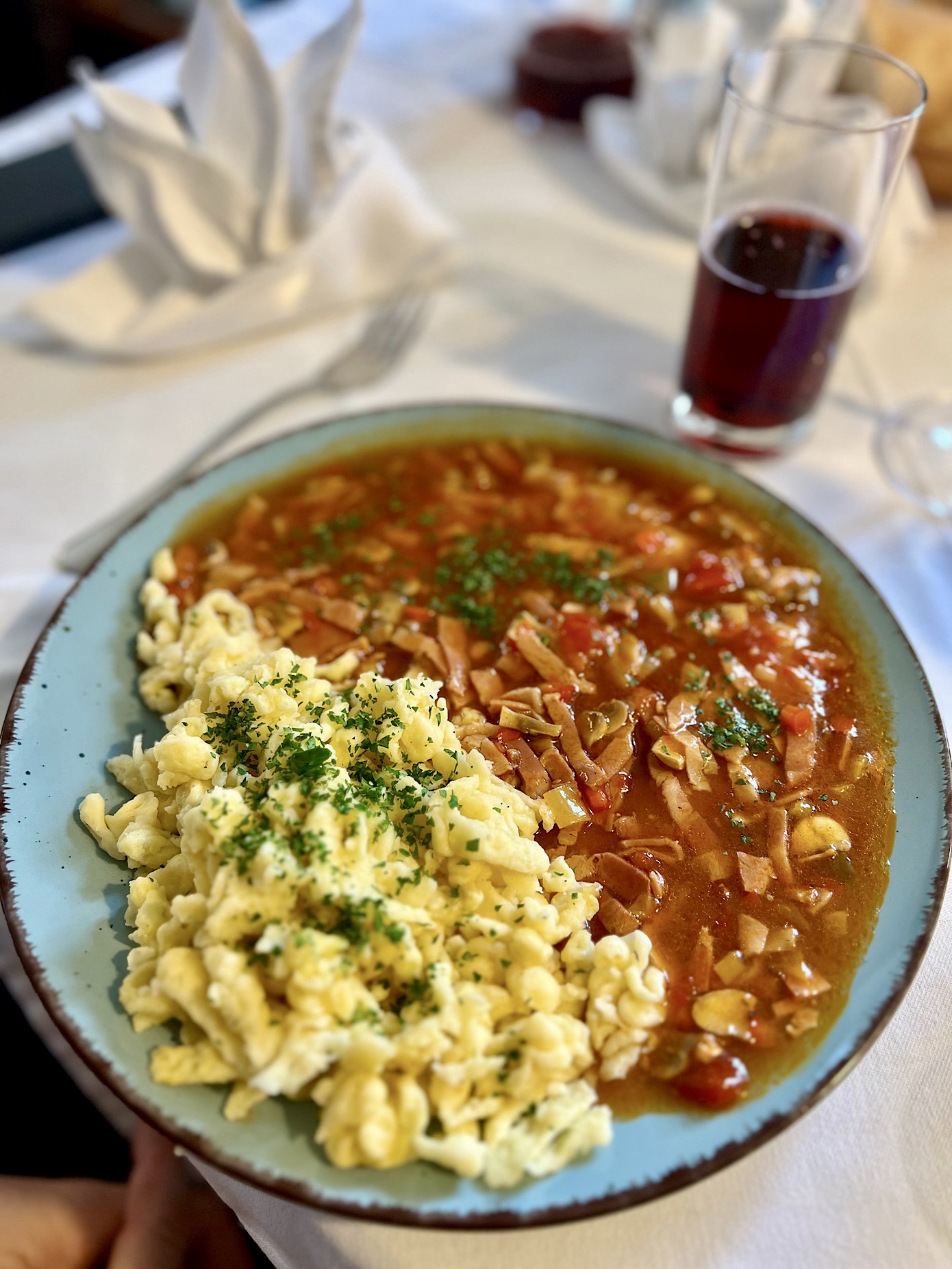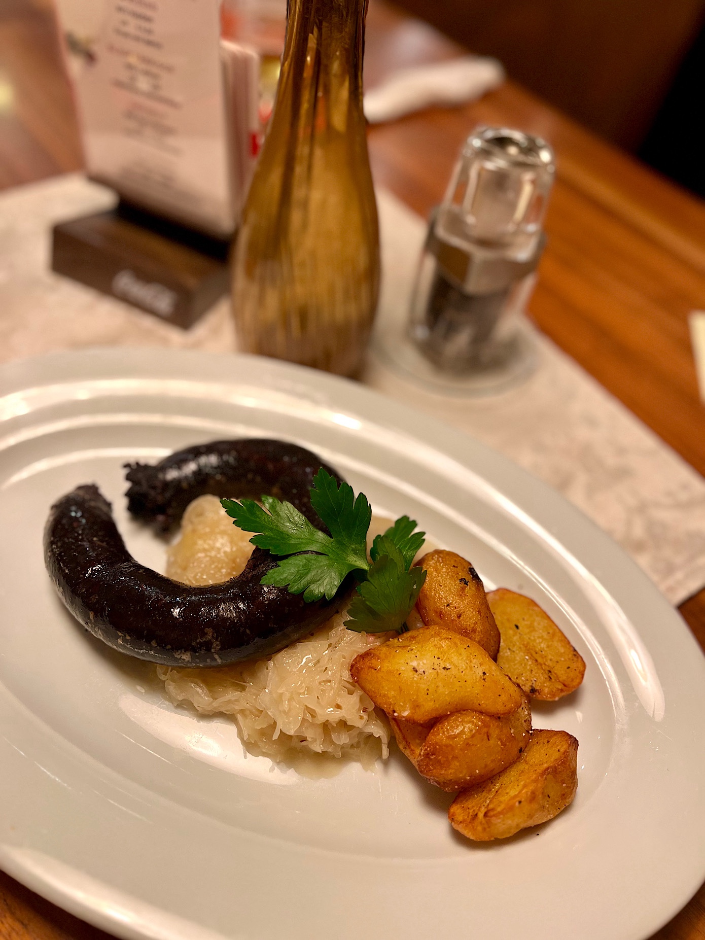 To właśnie tutaj spróbowałem arcypysznego sznycla ze świnki ze smażonymi ziemniakami oraz żurawiną (17 EURO). Piszę spróbowałem, bo danie zamówił kolega P., a ja konsumowałem nadziewanego serem i szynką Metzger Sznycla (18 EURO).