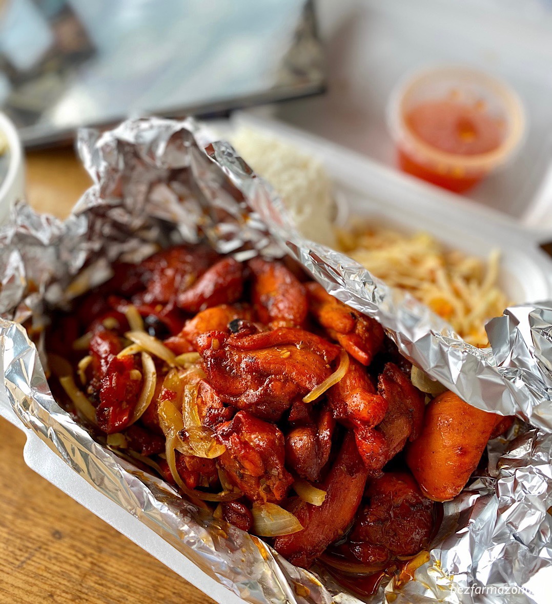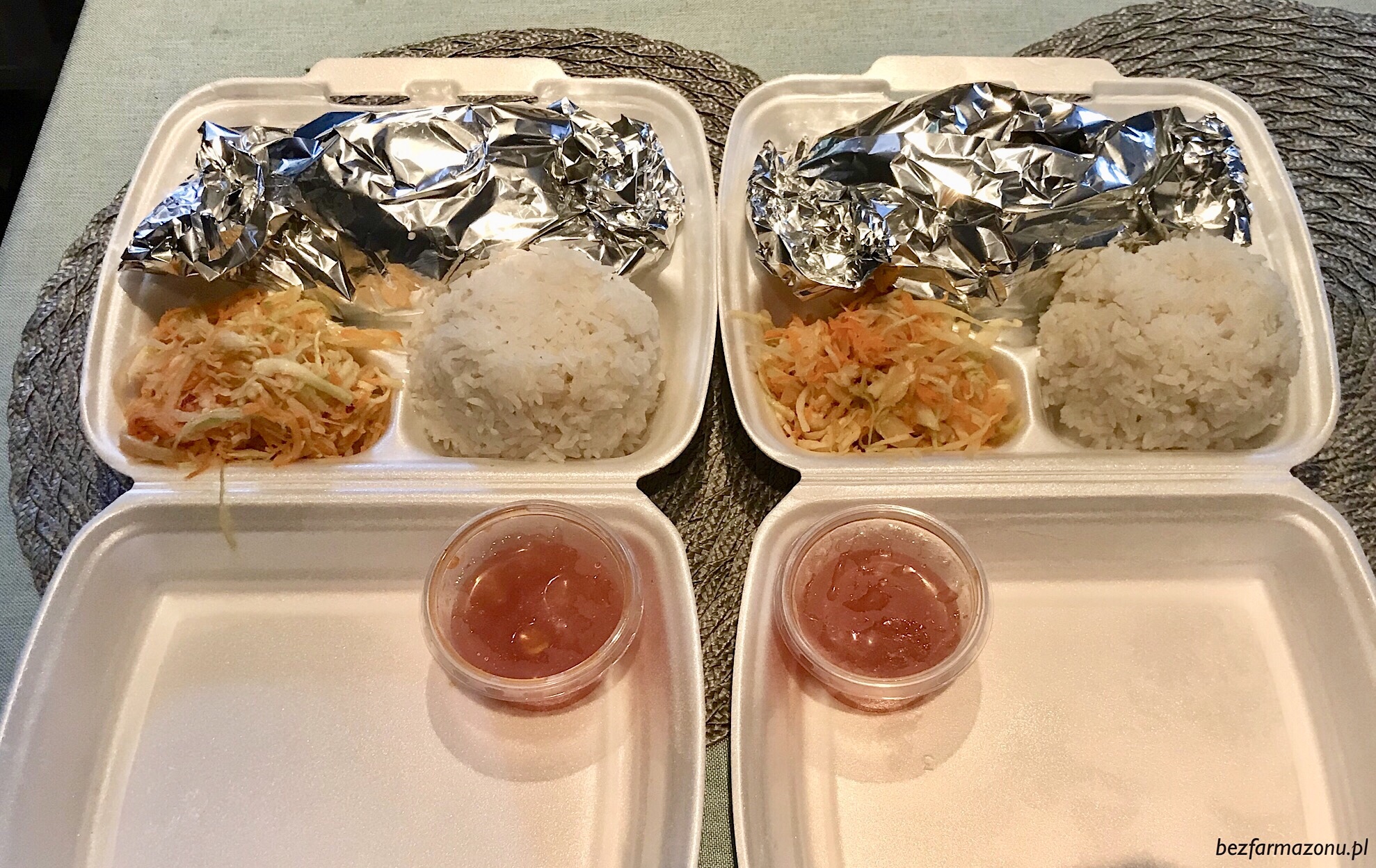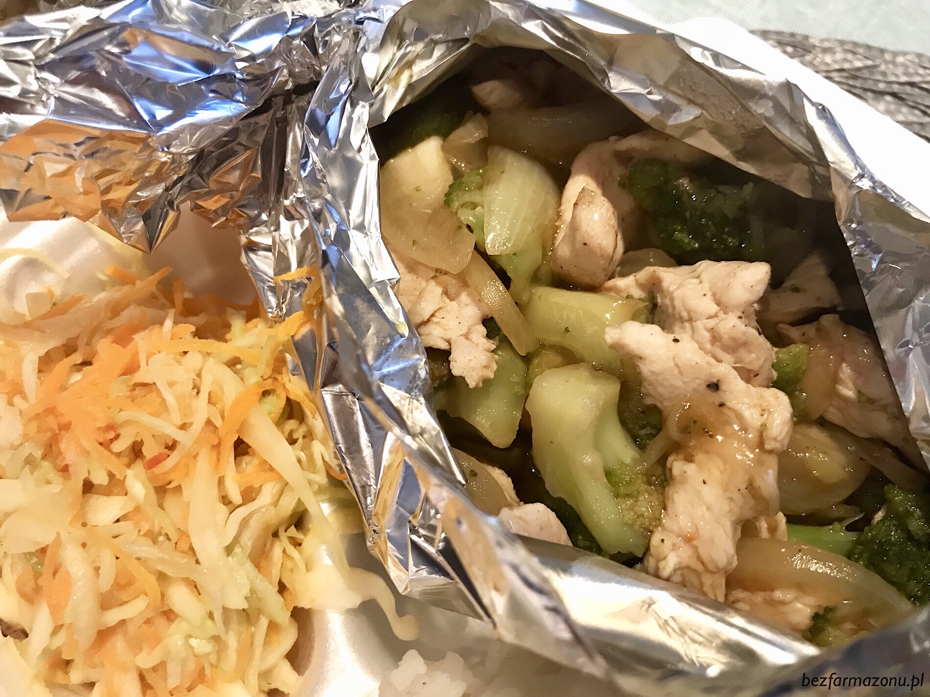 Dzięki temu iż mięsiwo jest starannie zapakowane w aluminium, niestraszna jest tym daniom podróż. Po ponad dziesięciu minutach są dalej gorące. Kaczucha w porządku, niespalona i z miękką skórką. Kurczak intensywny i bez niejadalnych części. Ryżu spora kula, surówka tylko z odrobiną oleju.