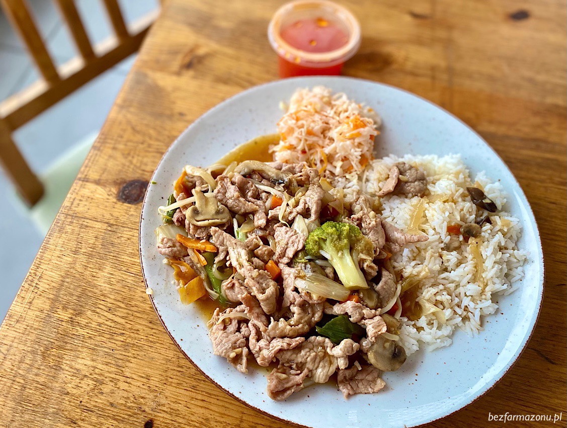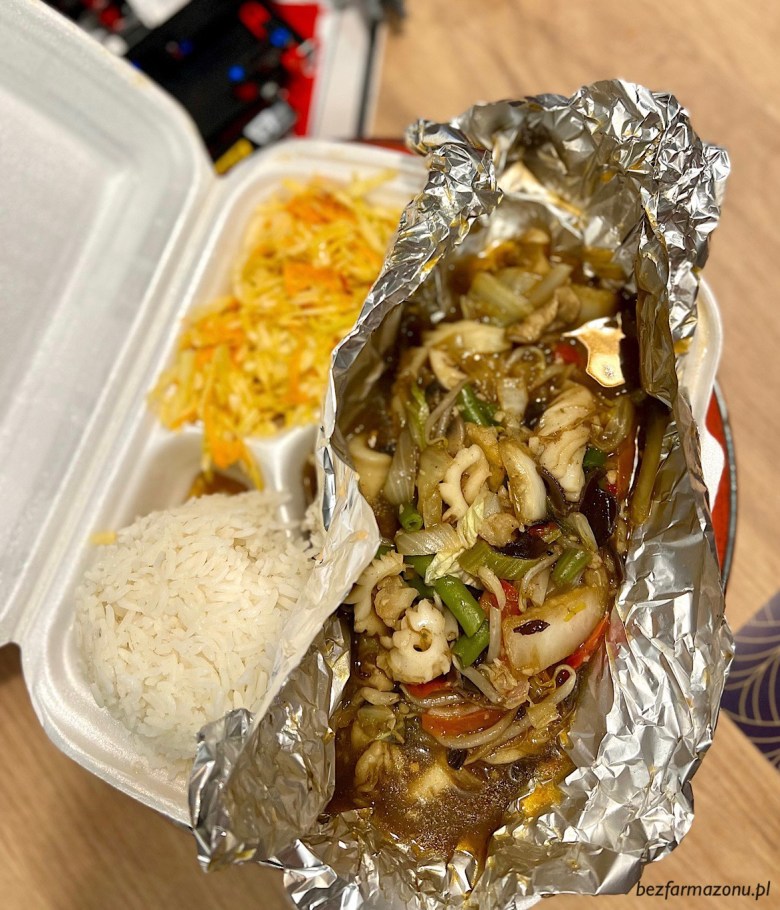 Od czasu do czasu sięgam po wieprzowinę z warzywami (28 PLN). Również i tutaj pozytywnie – zarówno jeśli chodzi o chude mięso (obawiałem się sporej ilości tłuszczu, ale widocznie wykrawane jest z łopatki bądź polędwiczki) jak i surówkę czy ryż.