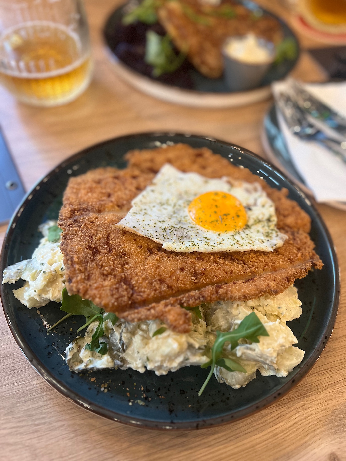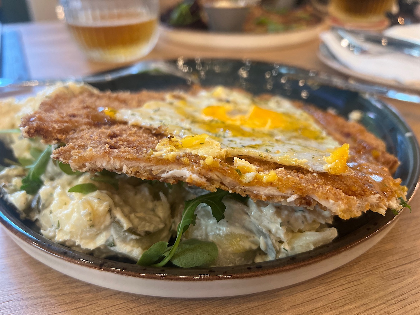 Schabowy w puszystym cieście ziemniaczanym byłby świetny gdyby nie dziwna, słodka (fuj!) modro kapusta (40 PLN).