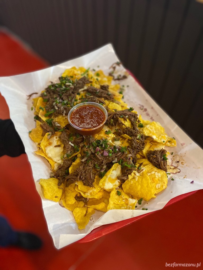 Nachosy można poprosić też oddzielnie z cheddarem oraz jednym z trzech dodatków (wołowina, guacamole, fasola). Wówczas taka porcja jest świetnym pomysłem do chrupania przy piwie.