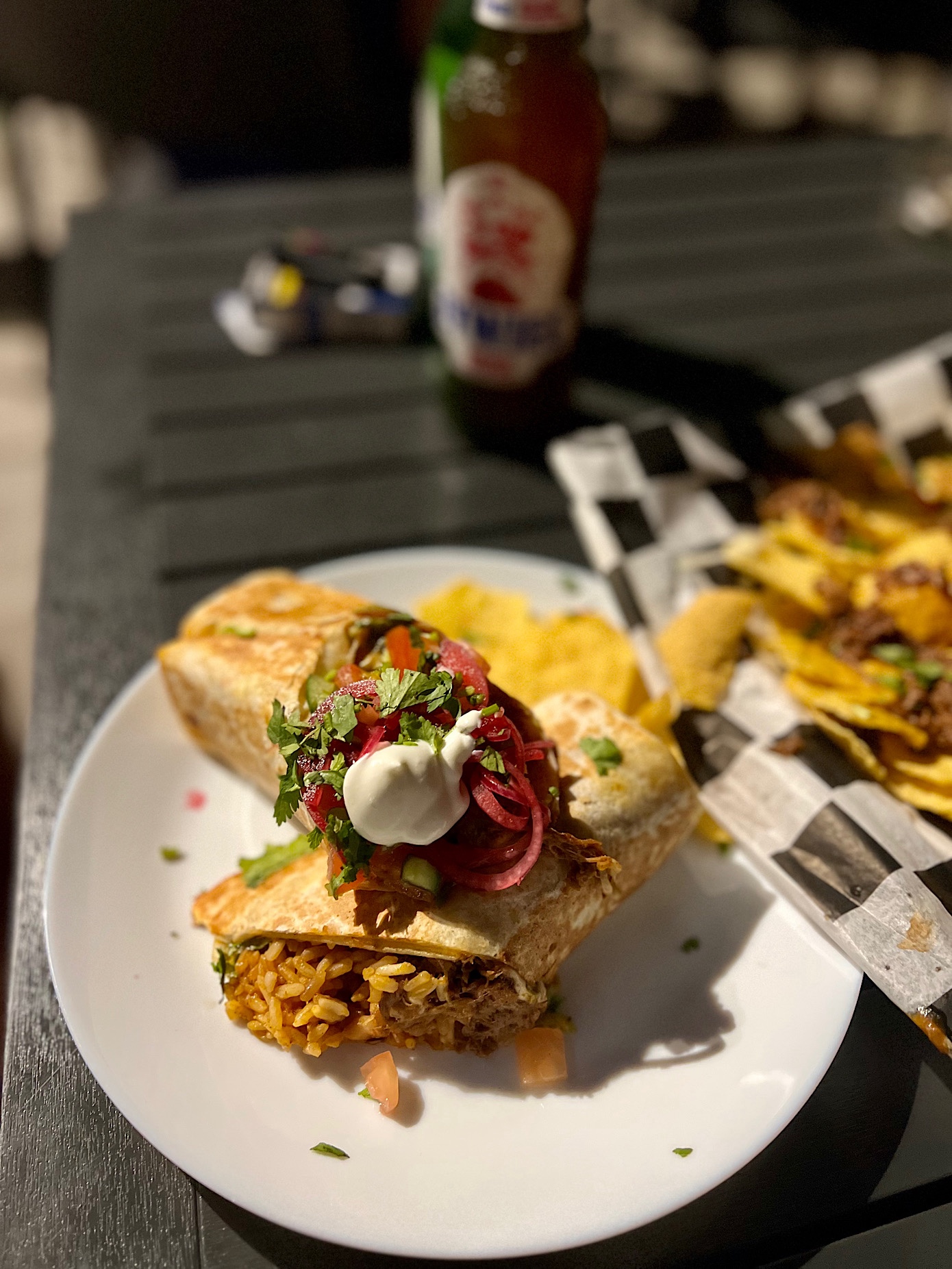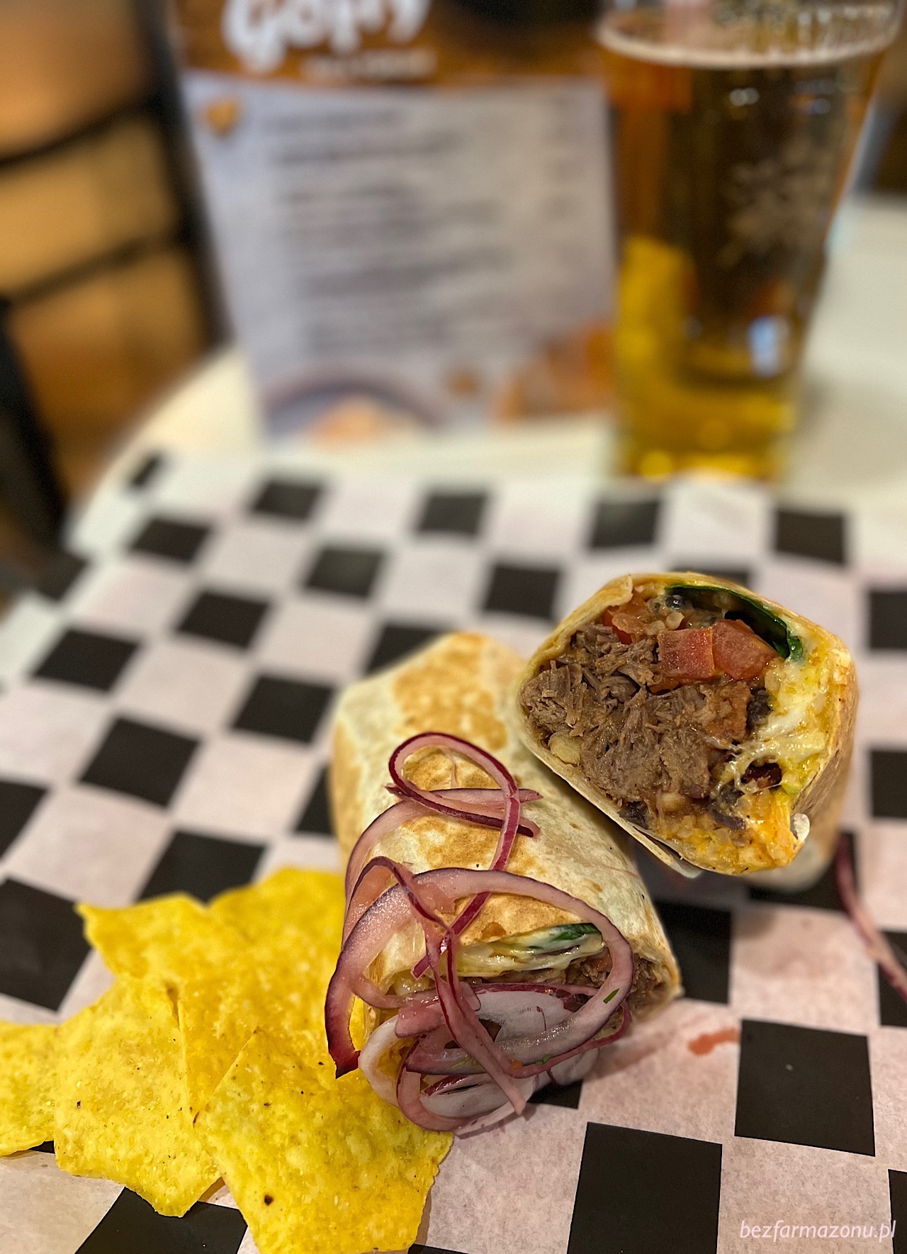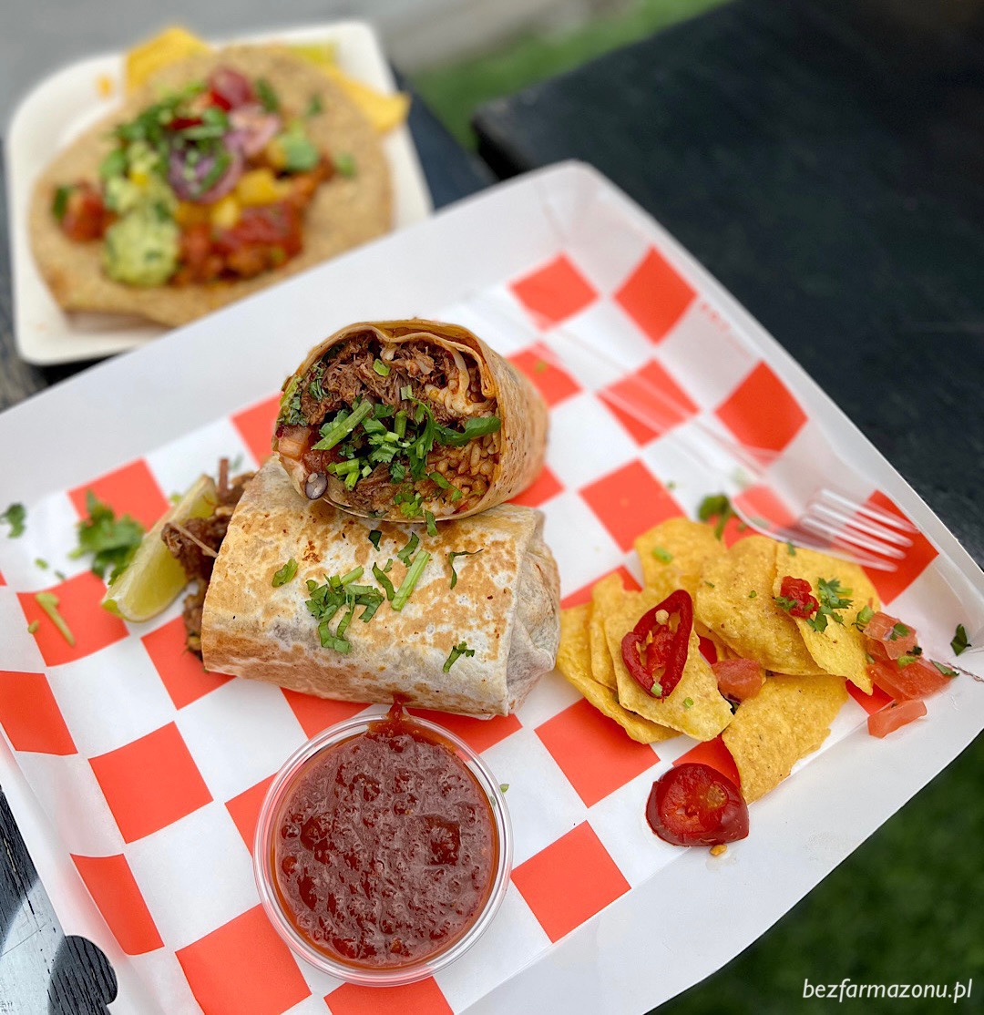 Burrito z wołowiną (29 PLN) charakteryzuje porządnie podgrzana – można zaryzykować stwierdzenie iż miejscami nawet chrupiąca tortilla. Jej wnętrze oprócz warzyw skrywa długo gotowane, szarpane mięso (któremu nie zaszkodziłoby więcej przypraw) oraz cztery rodzaje fasoli. W zestawie serwowane są niezłe kukurydziane nachosy (raczej nie domowe), lecz niestety w liczbie zaledwie kilku sztuk.