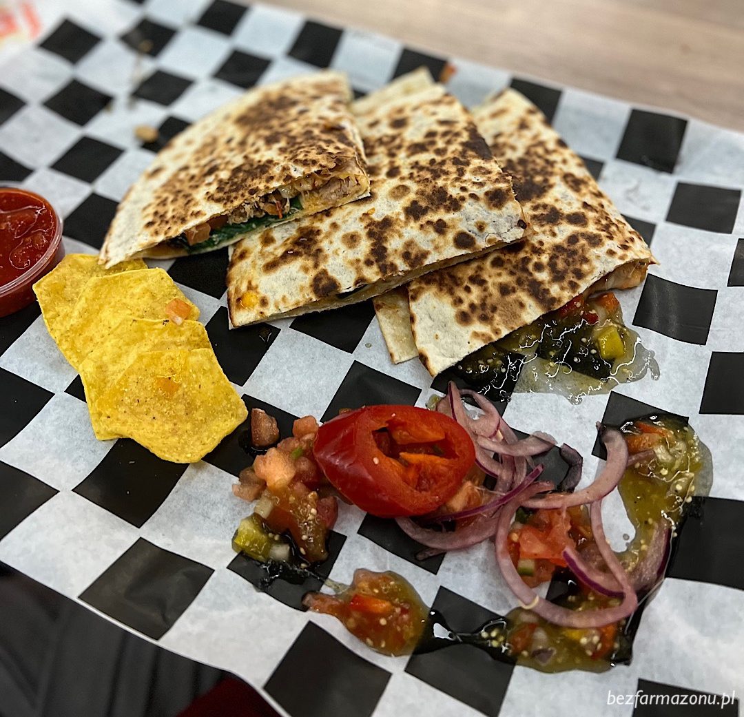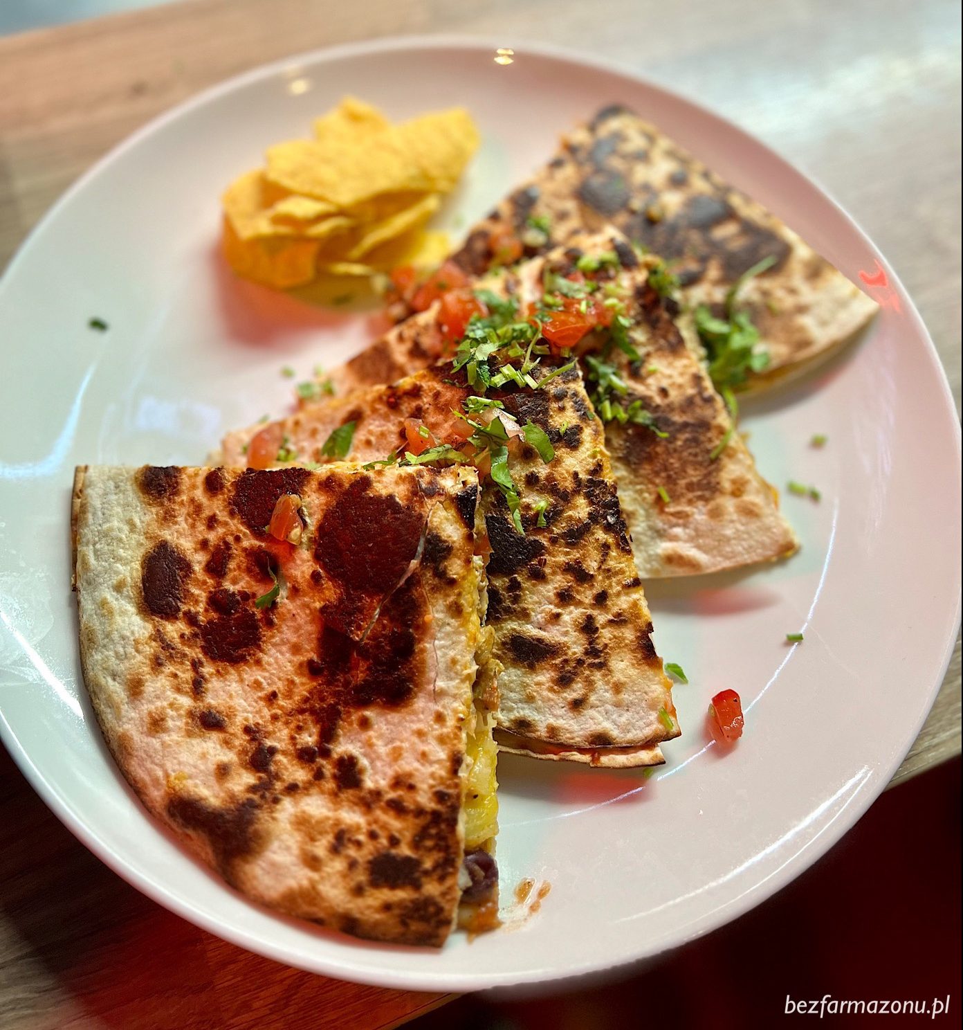 Tak wygląda ichniejsza quesadilla (30 PLN). Jeden kawałek nie załapał się na zdjęcie. Sama strawa bardzo komfortowa i taka trochę bardziej fasfoodowa.