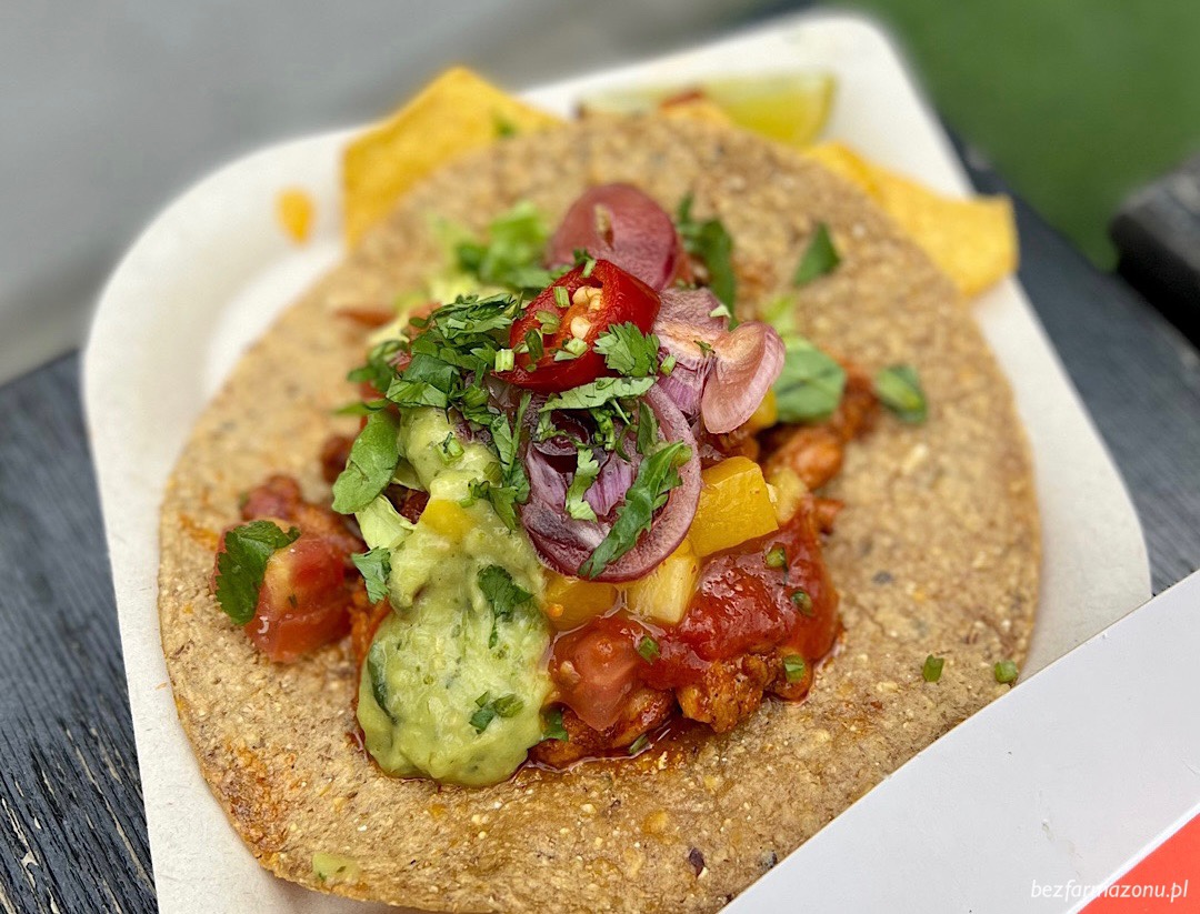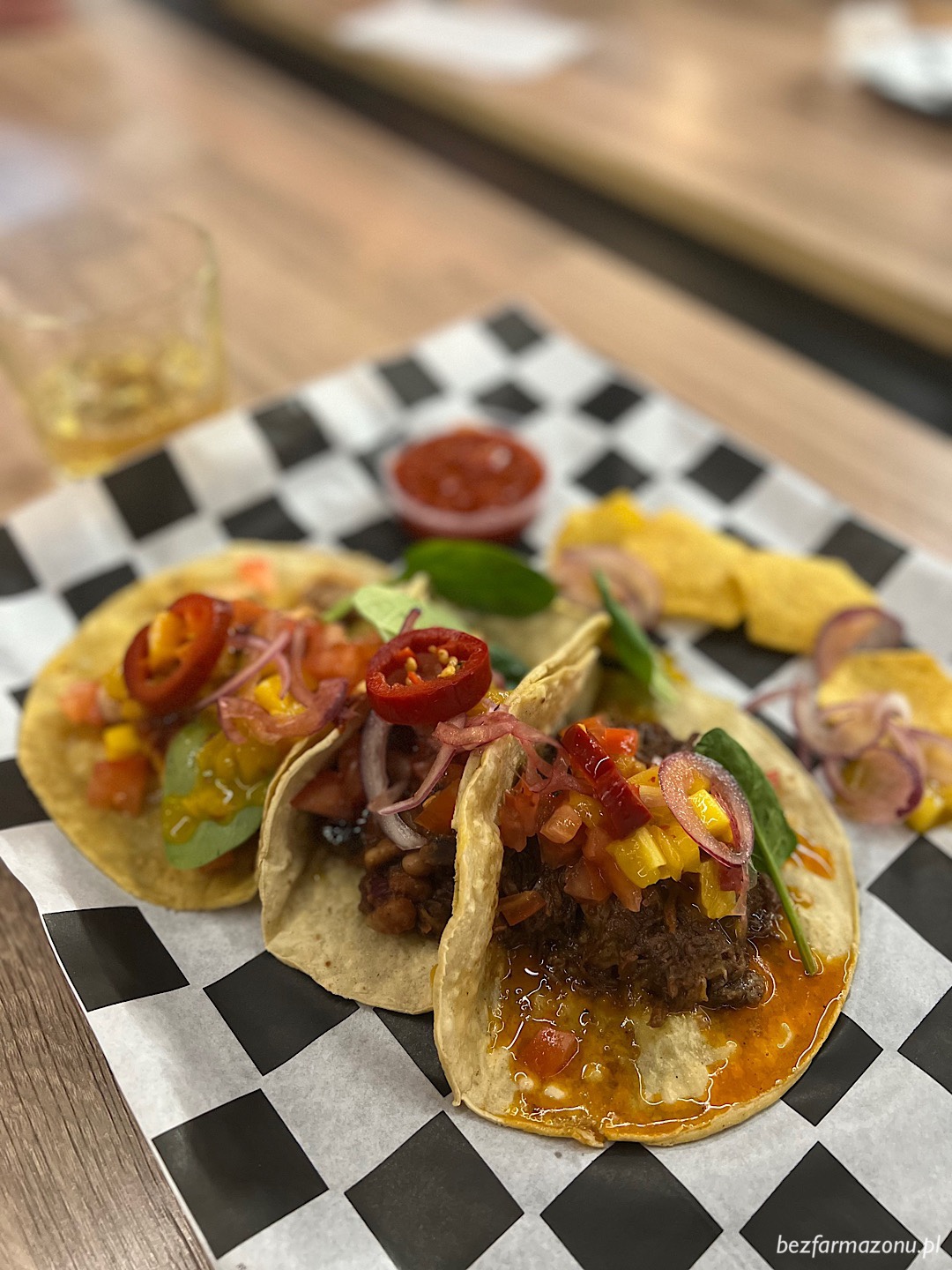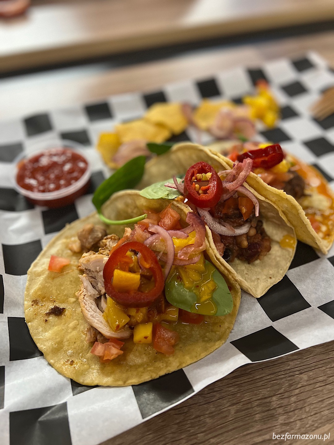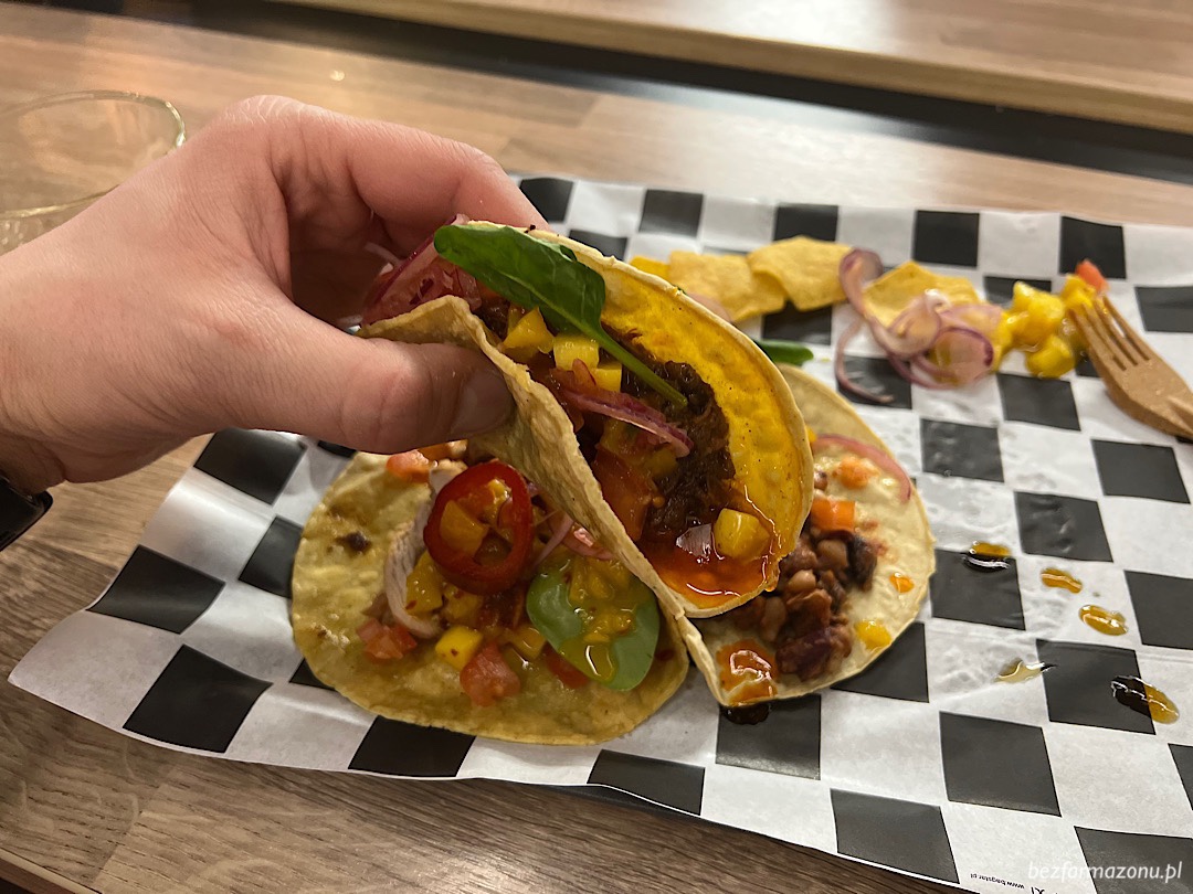 Tacosy zamawia się na sztuki lub w pakiecie trzech (28 PLN). Do wyboru wołowina, kurczak lub fasola. W komplecie świeże warzywa oraz kilka nachosów. Są smaczne.