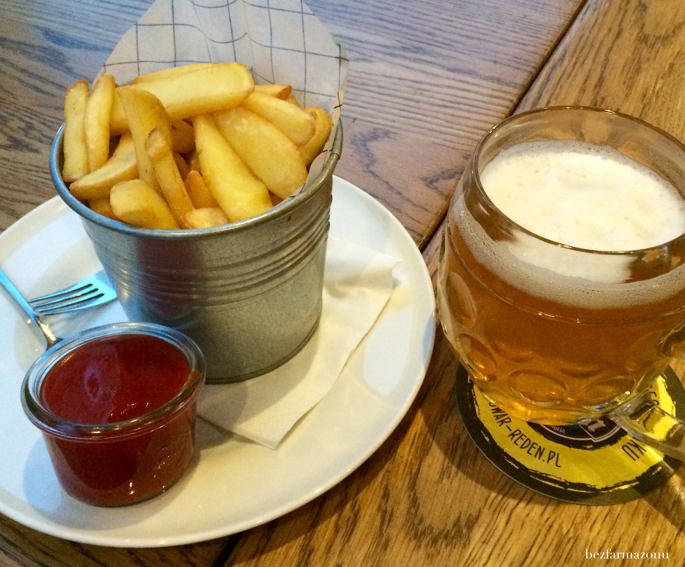 Podany w zestawie z miękkimi i trochę zbyt tłustymi na zewnątrz (nie chrupiącymi) ale dobrymi w smaku frytkami, korniszonkami oraz smakowitym, słodkim ketchupem. Całość – uczciwe 32 złote.