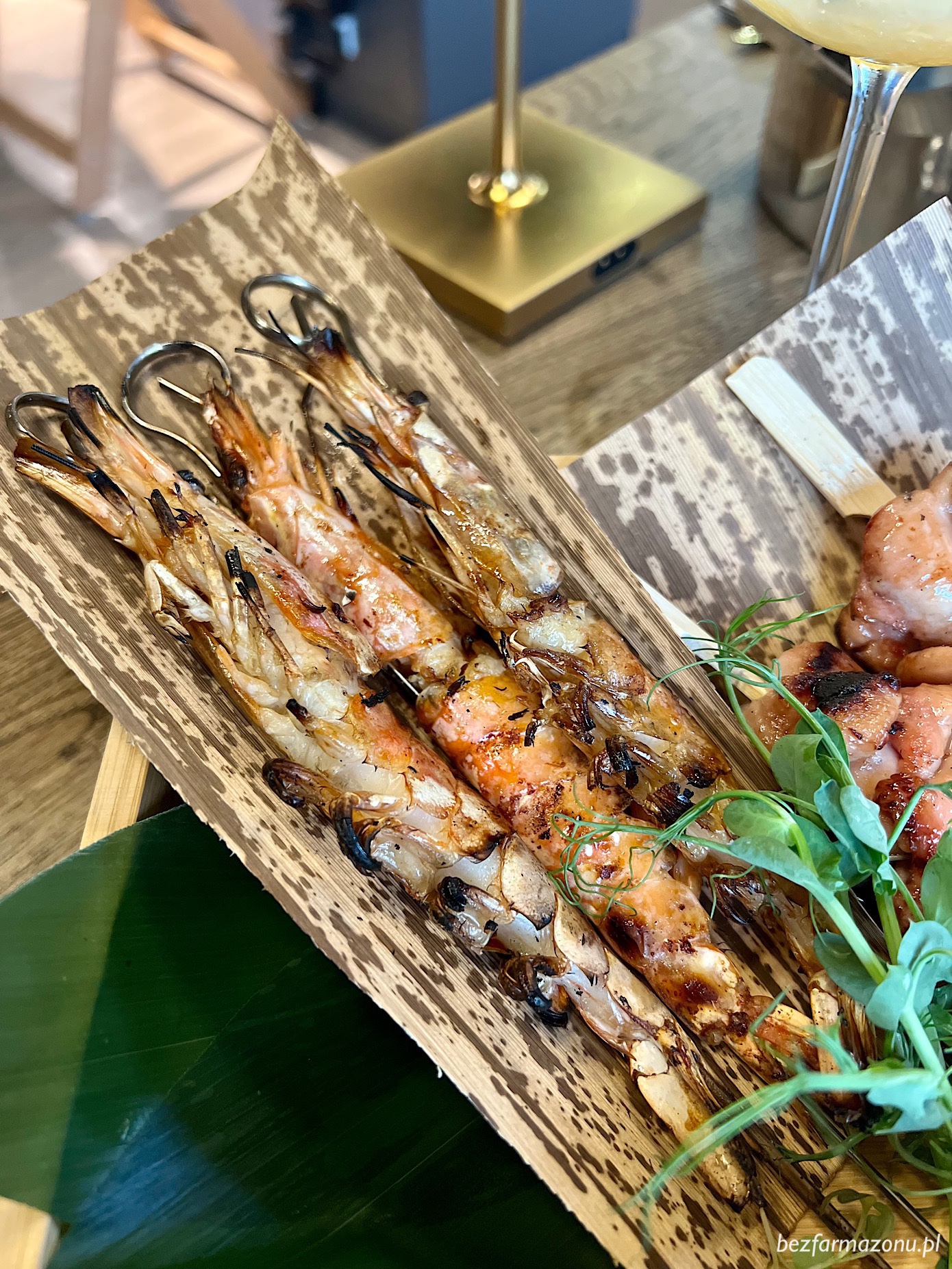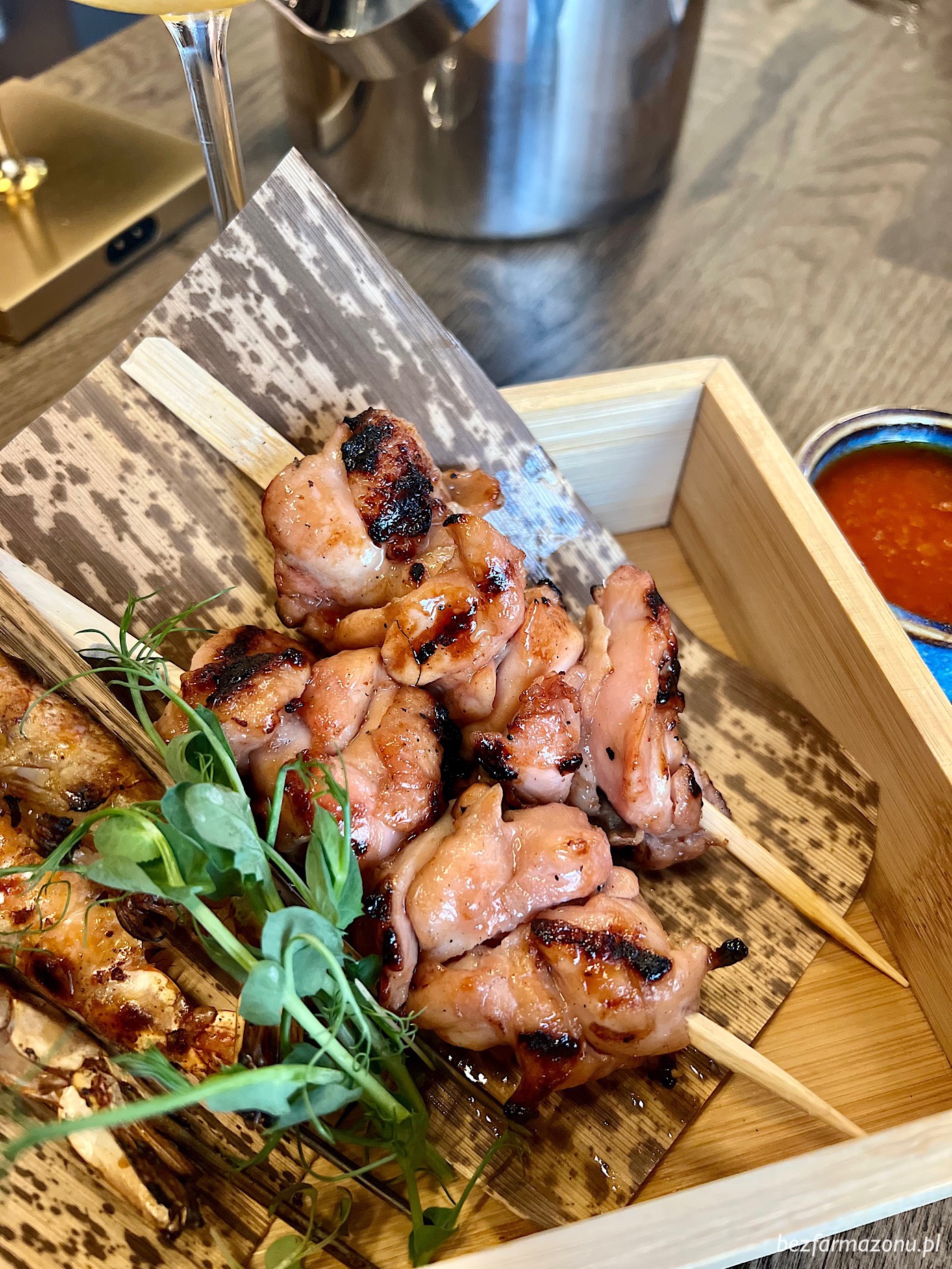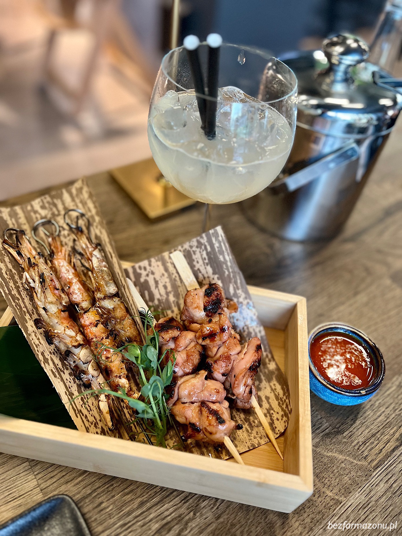 Z owego grilla zamówiliśmy dwie pozycje: Yakitori – szaszłyki z udek kurczaka w sosie tare (24 PLN) oraz Ebi – grillowane krewetki argentyńskie z masłem gochugaru (33 PLN).