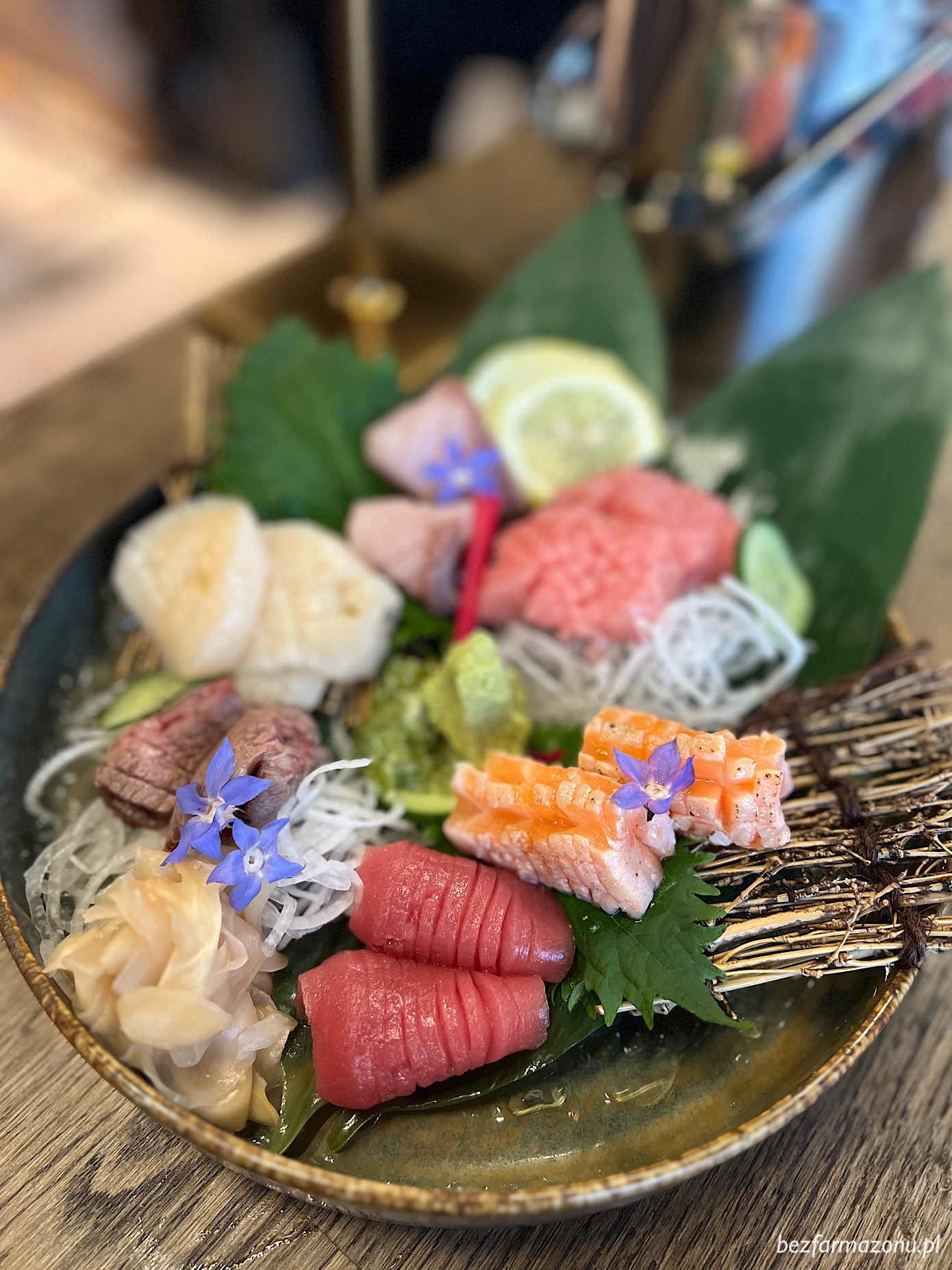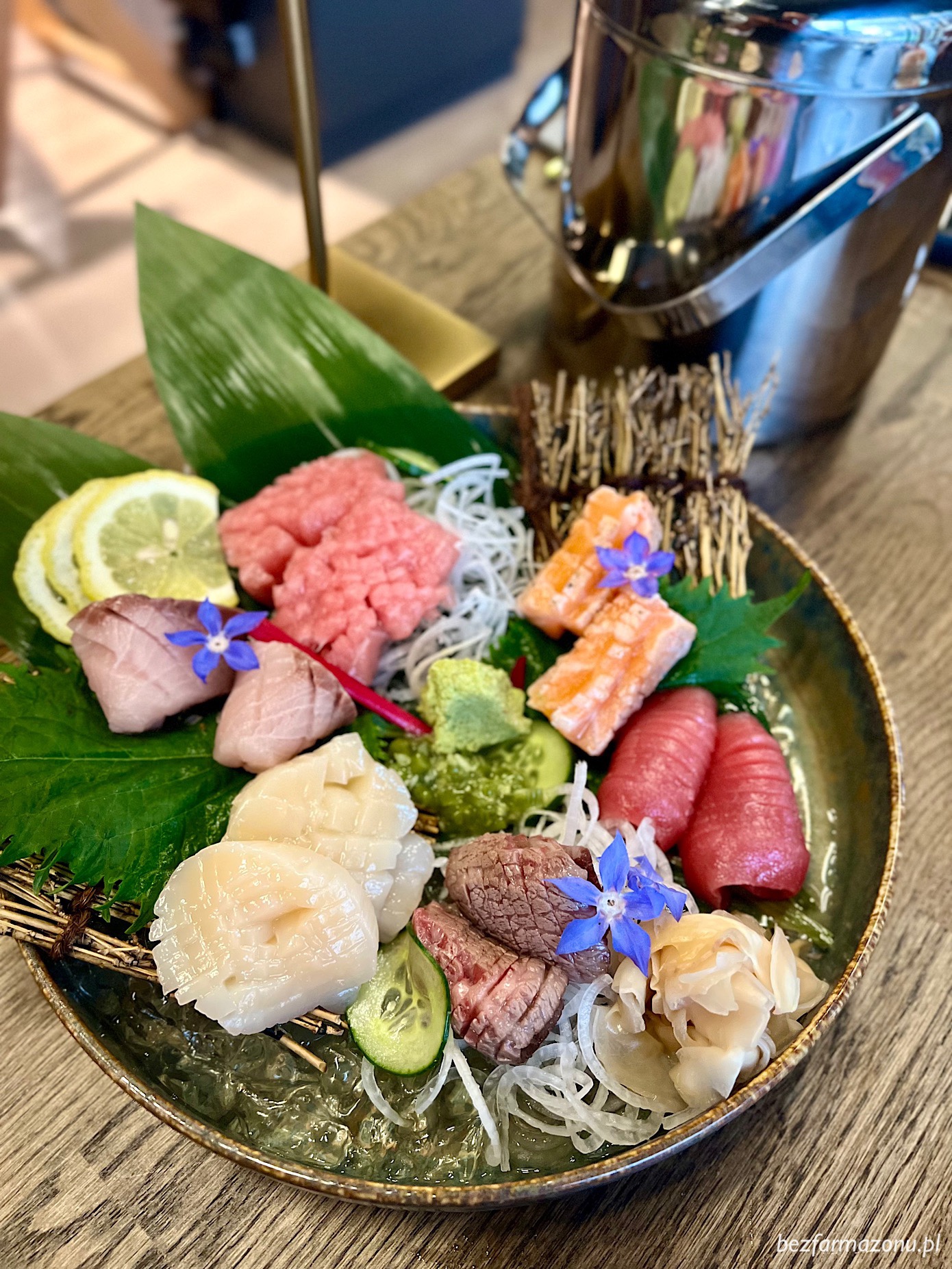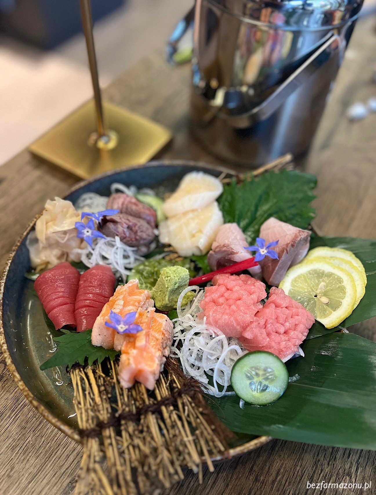 Na zamówionym talerzu wdzięczyły się: tuńczyk akami i chu-toro, podbrzusze łososia, przegrzebki, seriola i delikatnie opalana wołowina Wagyu. Jeśli ktoś nie lubi w pełni surowego smaku, nic nie stoi na przeszkodzie aby wymienione produkty skropić cytryną lub potraktować wasabi czy lżejszym miksem chrzanu i wodorostów.