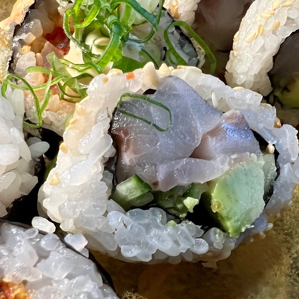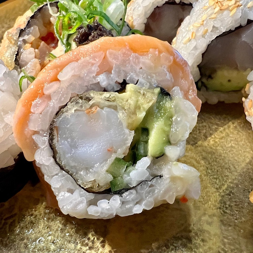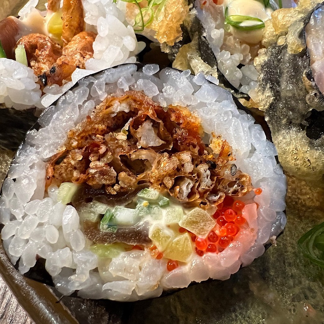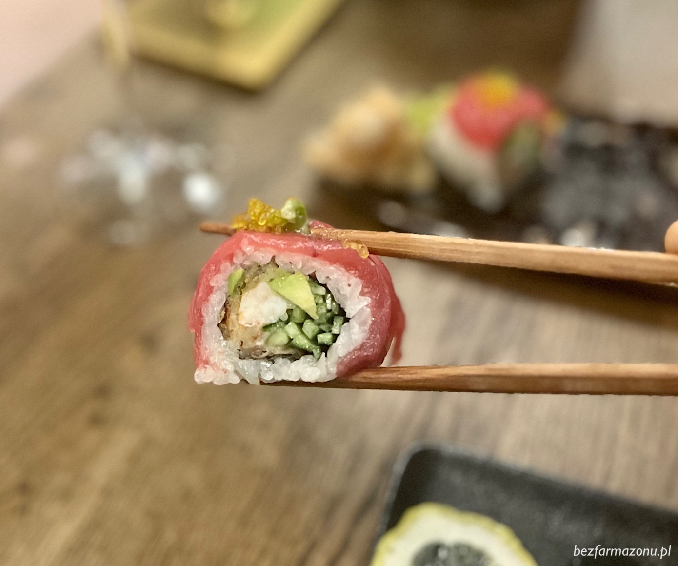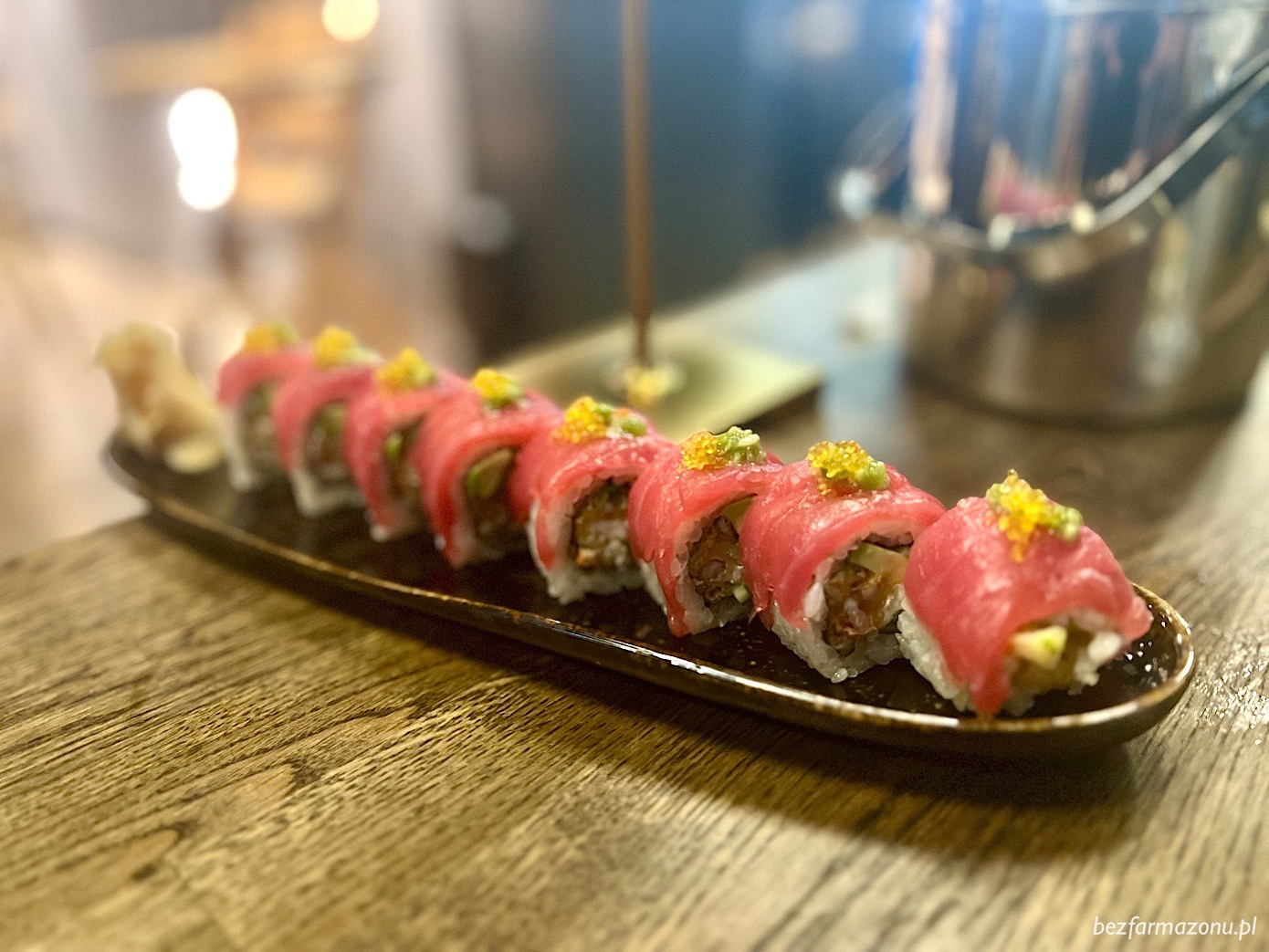 Krab w tempurze, awokado, ogórek, tuńczyk błękitnopłetwy, kizami wasabi, czarny kawior (63 PLN). Rolki top. Super zbalansowane, doskonale sklejone, rześkie, miękkie na zewnątrz i z chrupkiem w środku. Pyszne!