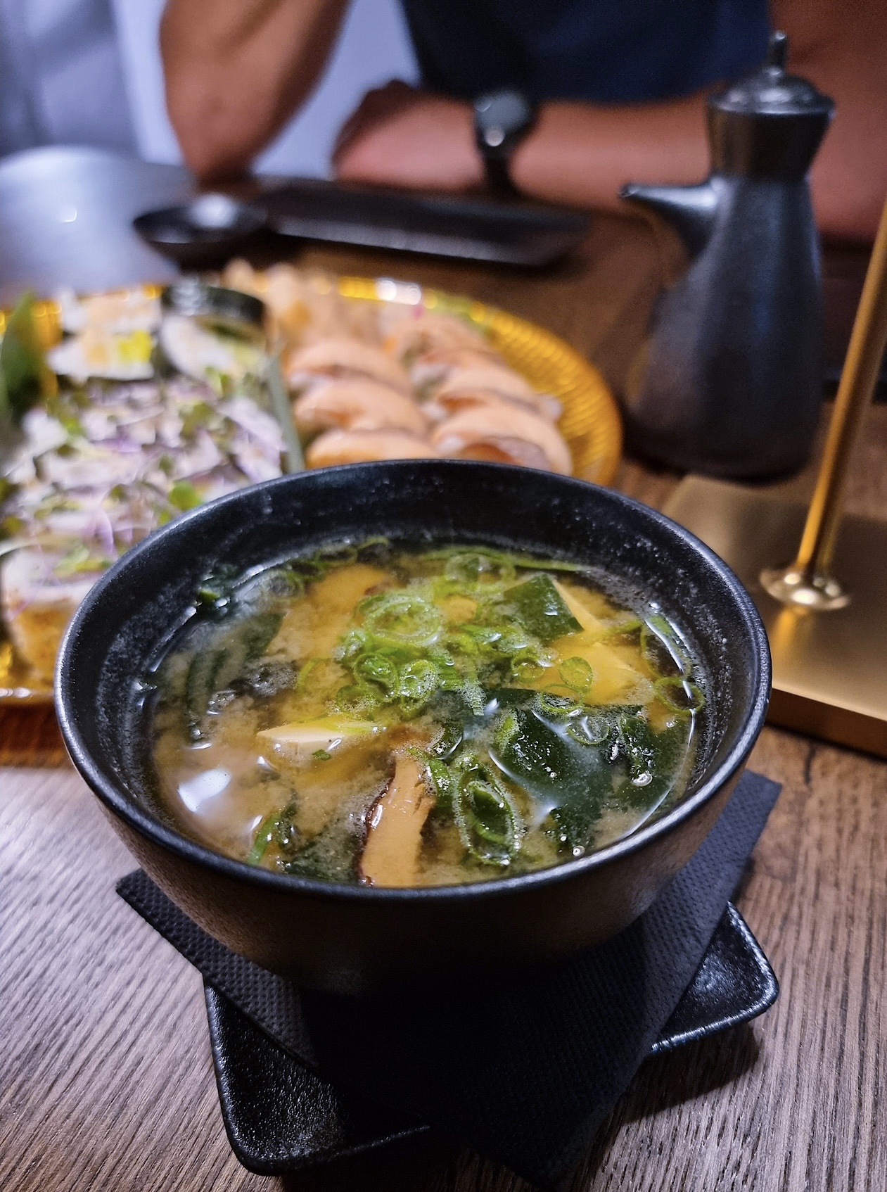 250 ml zupa Miso Shiru (19 PLN) na bulionie dashi z pastą miso, shitake, wakame, tofu i szczypiorem bezbłędna.