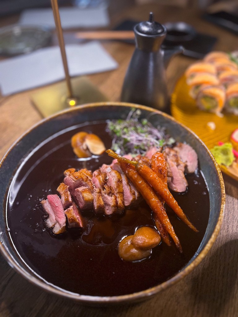 Sztosem okazała się kaczucha (61 PLN). Pokrojony w paski turbosoczysty filet z szerokodziobej spoczywał na ekstremalnie słodkim sosie czekoladowym z teriyaki.