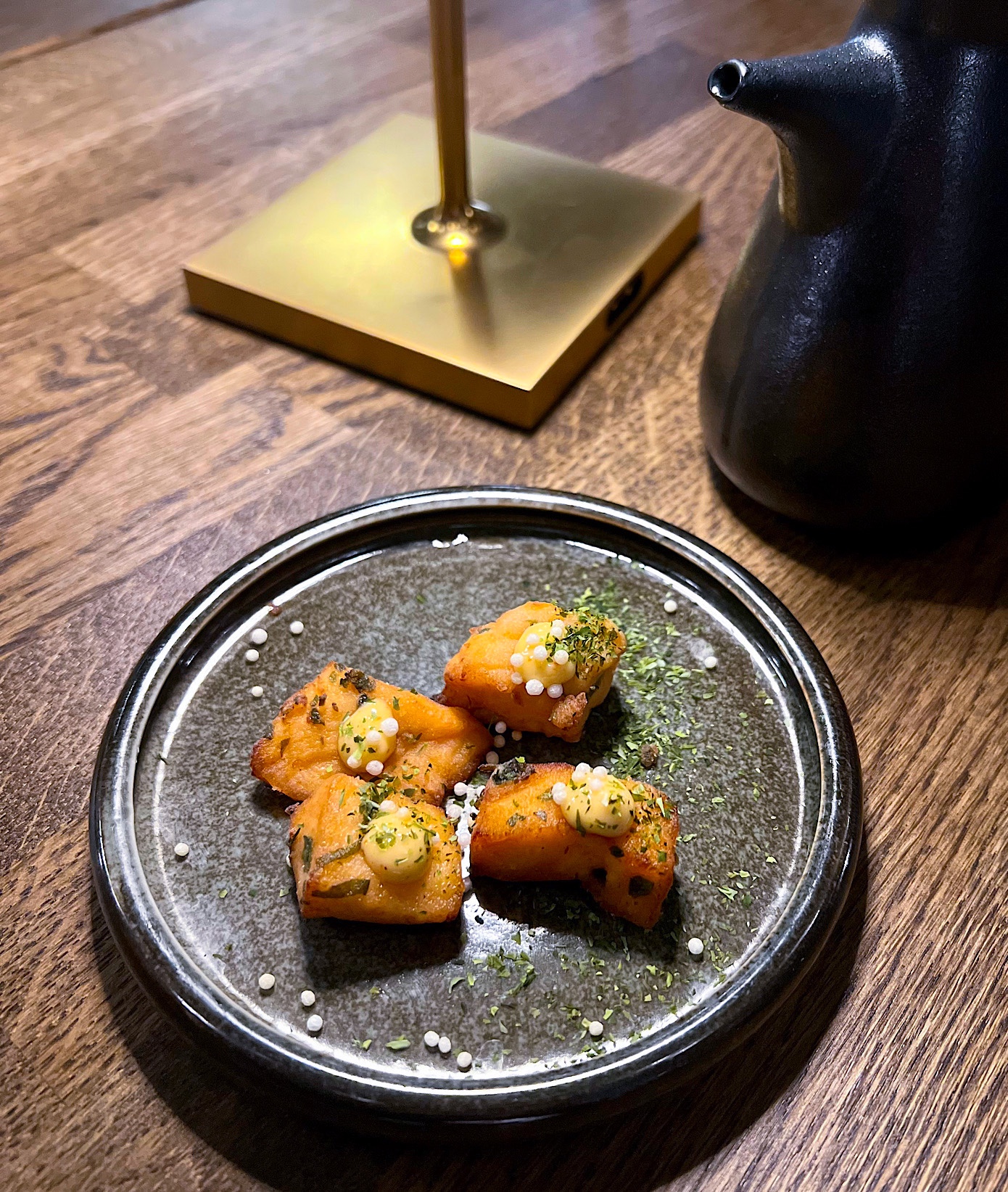 W połowie sierpnia 2023 na początku otrzymaliśmy poczęstunek w formie kąsków ciepłego łososia z wasabi mayo.