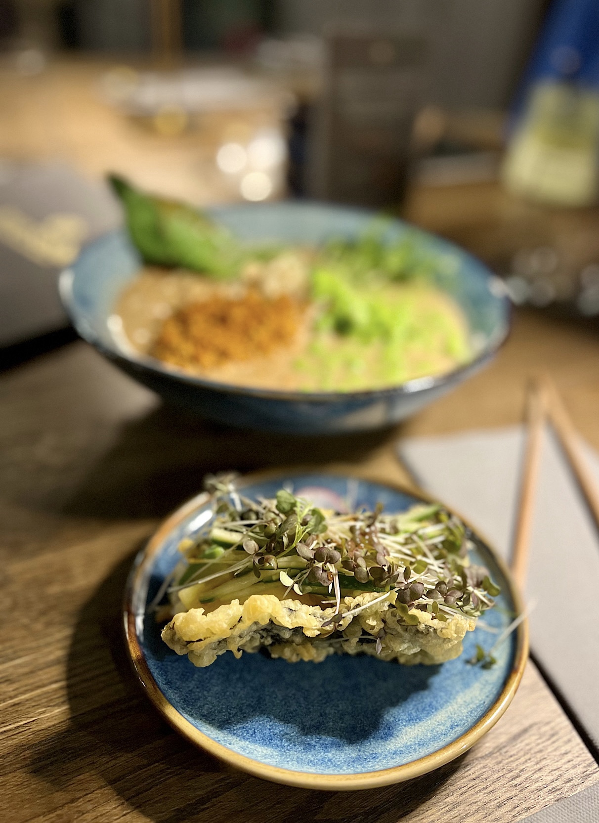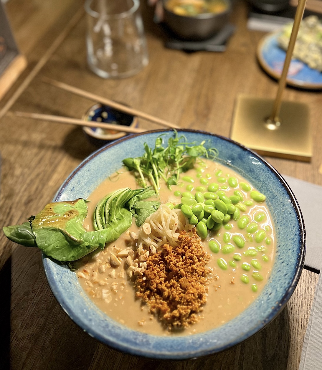 Piętnaście minut później pojawił się bardzo słaby, nudny, ledwo ciepły wegetariański tantanmen ramen (36 PLN) ze smażonym tofu, zmęczonym pak-choiem, toną edamame oraz orzechami ziemnymi. Najgorsze w nim były jednak sklejone, miękkie i ogólnie mizerne kluchy.