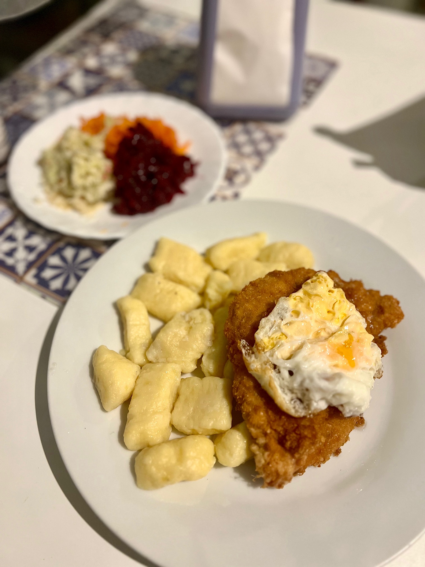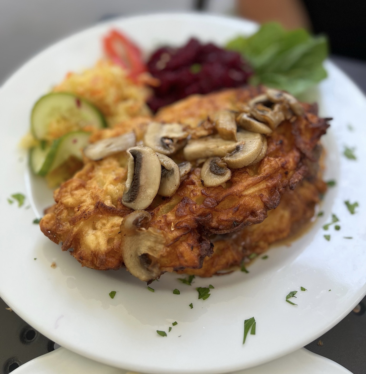 Grube, puszyste najprawdopodobniej ręcznie tarte placki ziemniaczane z chudym gulaszem wieprzowym i surówkami (35 PLN) oceniliśmy jako danie satysfakcjonujące jednak kompletnie nie przyprawione.