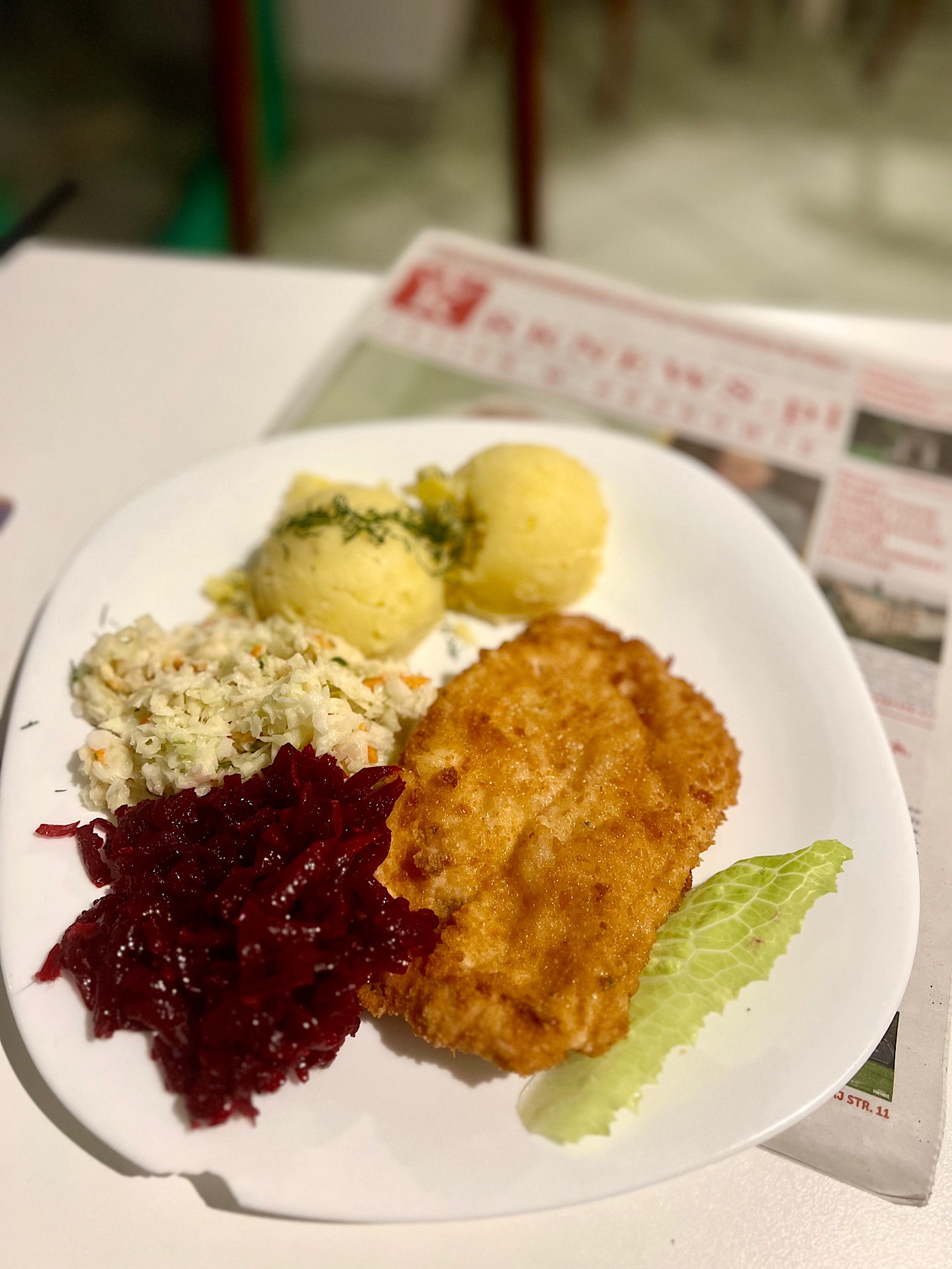 Porcje są spore i rozsądnie wycenione. Na rycinach świeżo bity schabowy (14 PLN), kopytka (6 PLN) i zestaw surówek (5 PLN). Obok panierowany kurak (14 PLN), gniecione ziemniaki (4,50 PLN) i również zestaw surówek.