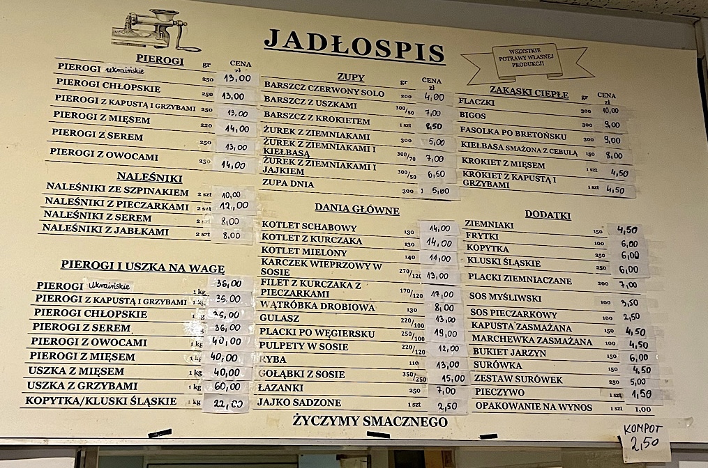Porcja 10 sztuk pierogów ruskich do odgrzania w domu kosztuje 9 złotych, a żurek z kiełbasą złotych raptem siedem! Nikt tu nie zbankrutuje!