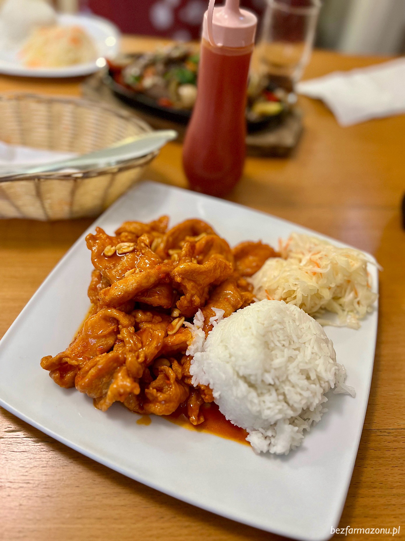 Przy kolejnej wizycie na ruszt wjechała skwiercząca na półmisku, miękka i nieżylasta, lekko doprawiona wołowina z warzywami oraz ekstremalnie dobry kurczak gong bao z orzeszkami, którego przygotowuje się tutaj bez panierowania. Najsłabszym ogniwem okazał się kompletnie bezpłciowy ryż. Surówka oraz znajdujący się na stole słodki sos jak najbardziej w porządku.
