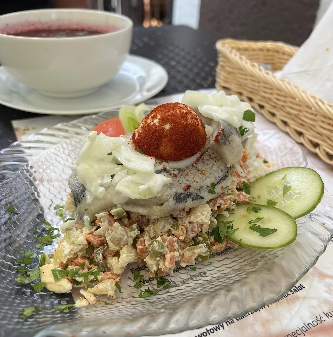 Morska ryba przypomniała mi o niegdysiejszych rodzinnych posiedzeniach. Tutaj było nadzwyczaj smacznie, lecz młodzi mogą nie zrozumieć sensu łączenia śledzia z ogórkami, cebulką, ugotowanym jajkiem oraz sałatką jarzynową i majonezem.