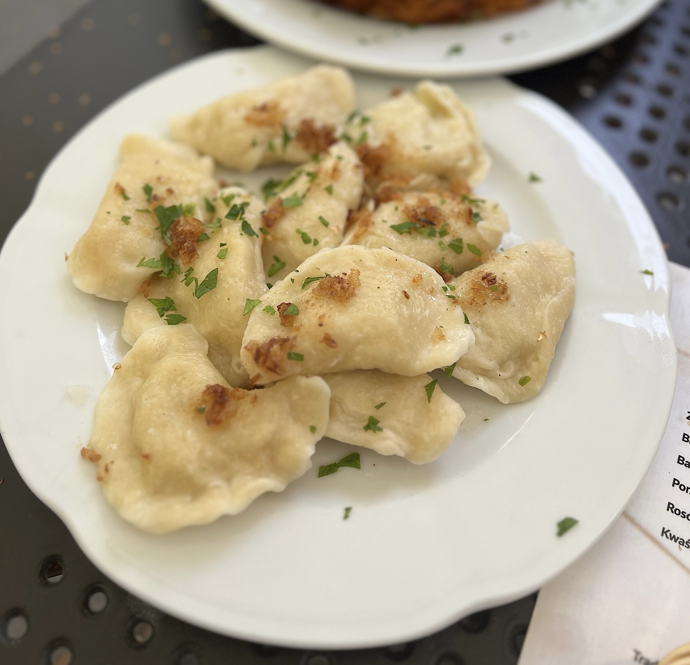 Pierogi ruskie (25 PLN) były w sumie ziemniaczane, bo dojrzenie tam twarogu graniczyło z cudem. Plus owy farsz był rozgotowany. Słabiutko.