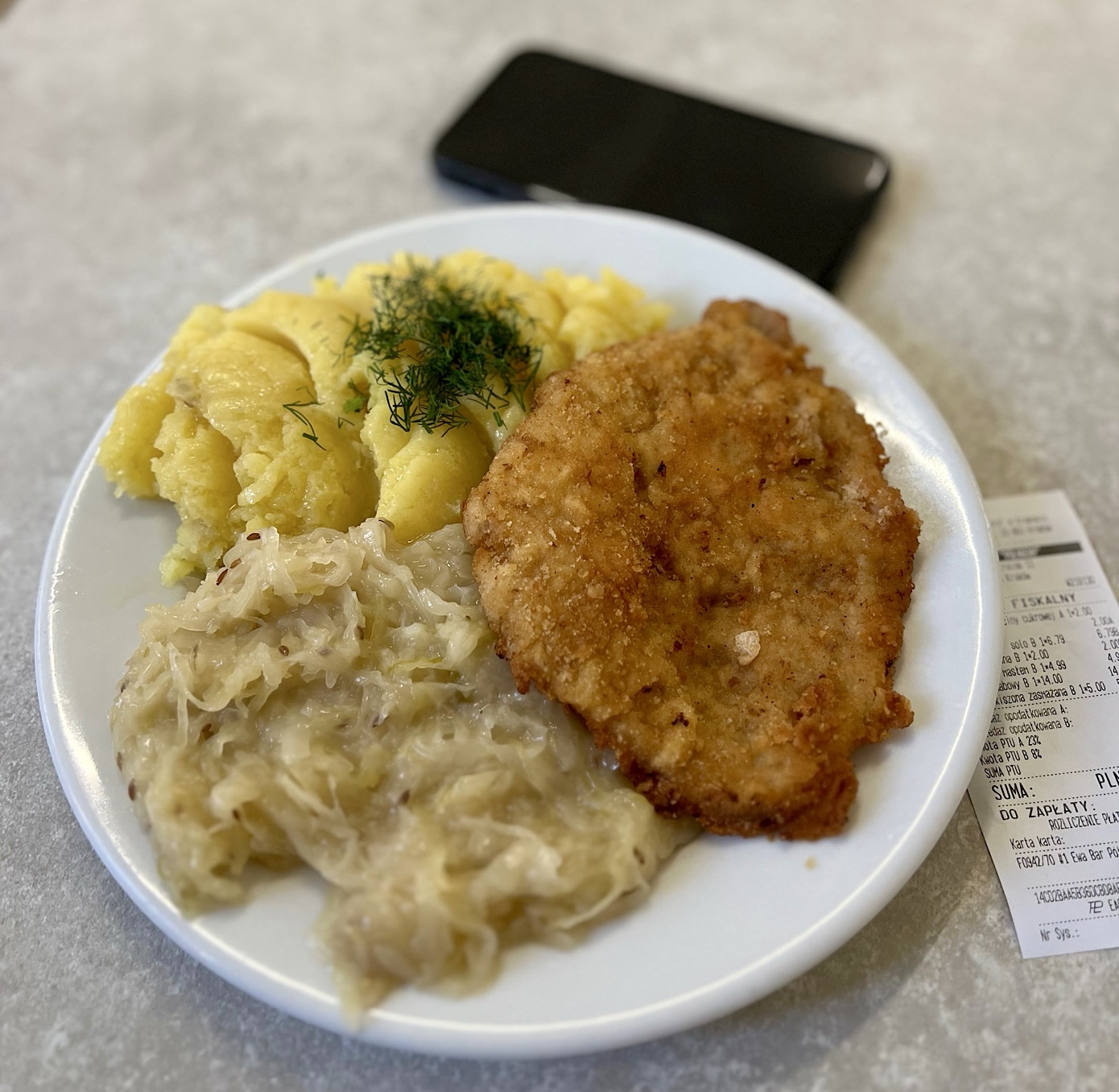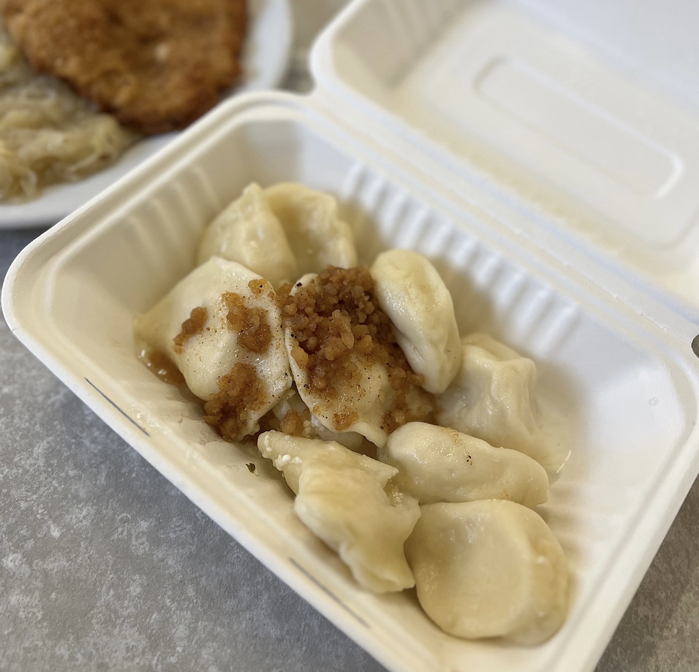 Zamówiłem tu schabowego (14 PLN) z ziemniakami z masłem (5 PLN) oraz konkretnie kwaśną zasmażaną kapuchą (5 PLN). Do wynosowego pudełka poprosiłem również ruskie (6,80 PLN) z zapomnianą w wielu jadłodajniach topioną, broń Boże nie spaloną słoniną (2 PLN).