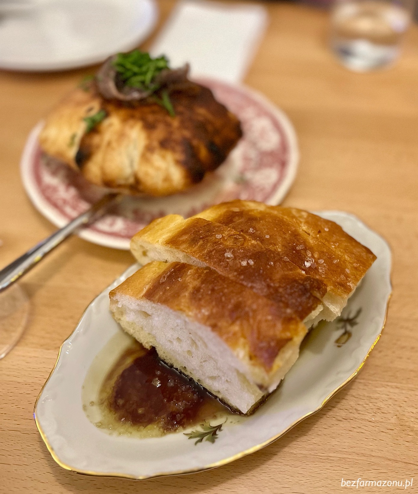 - świeżutkiej i pachnącej focacci z solą, oliwą i olejem z pestek dyni (16 PLN),