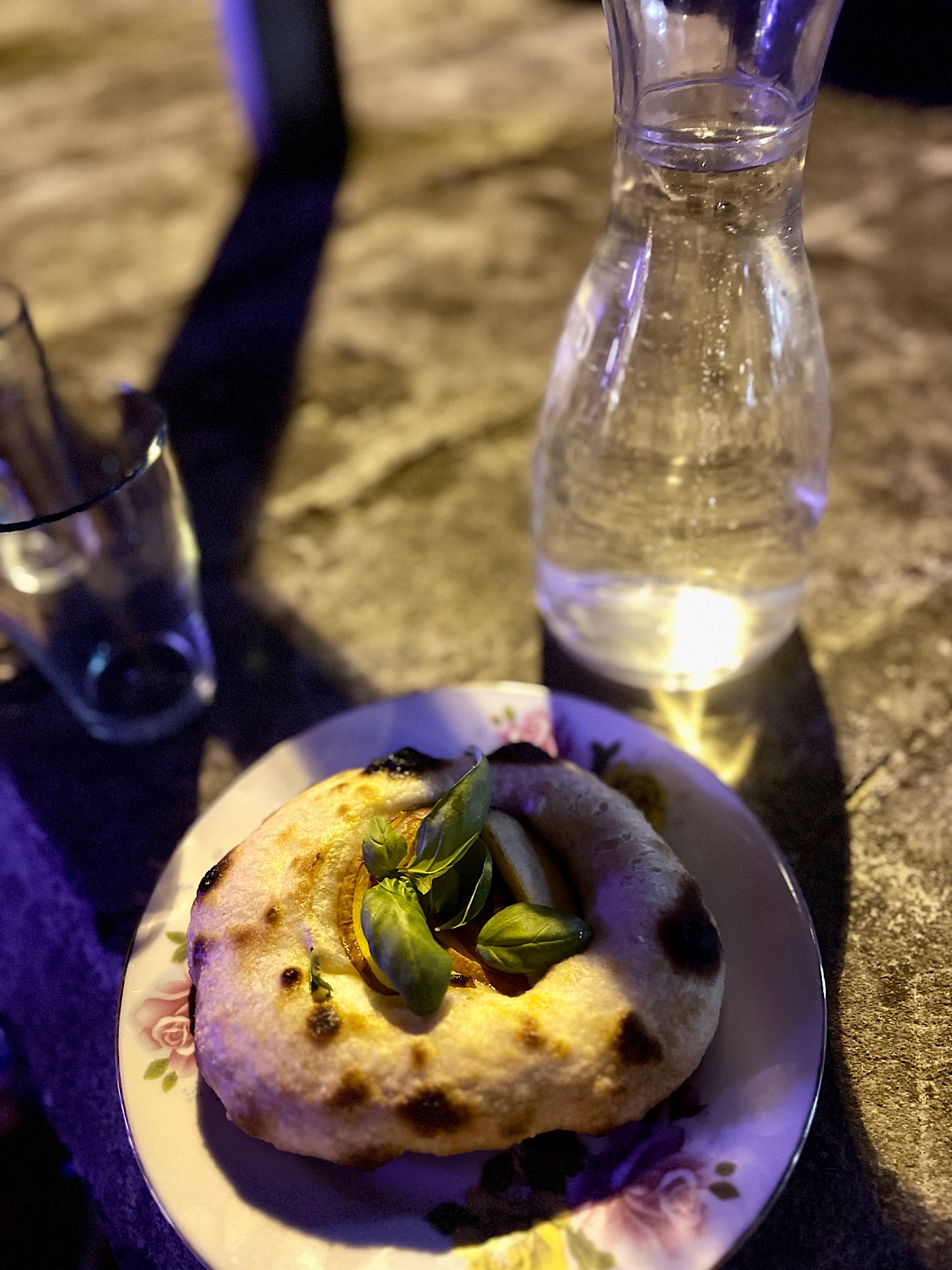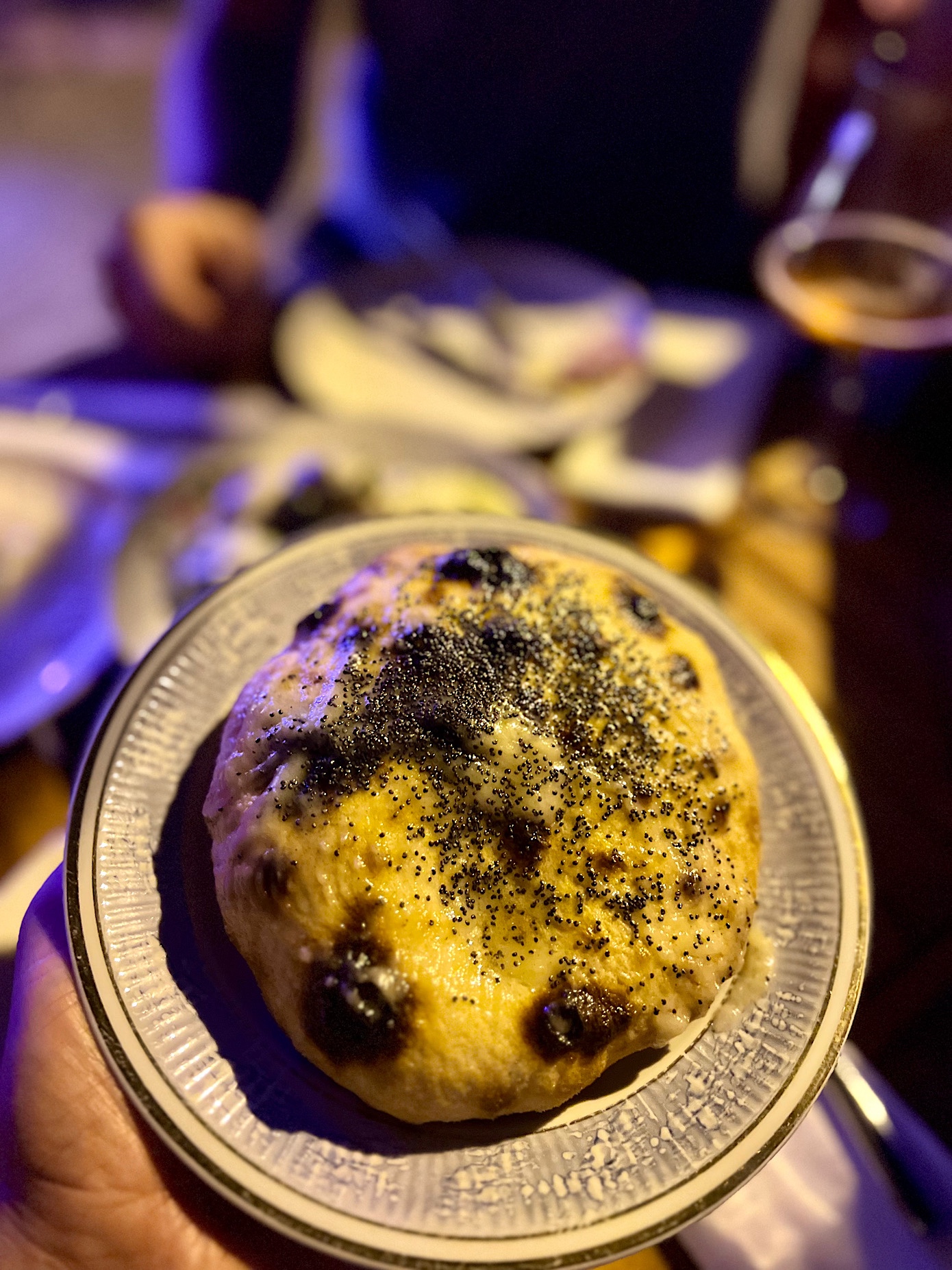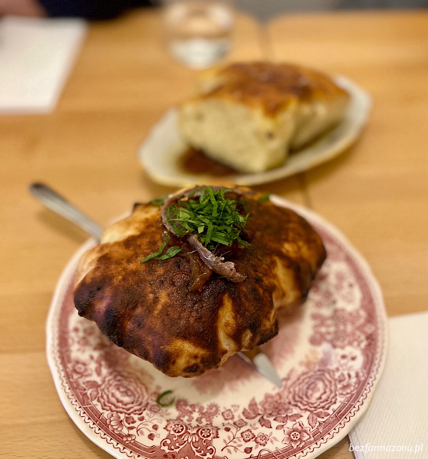 - nadmuchanej pity z masłem z karmelizowaną cebulką, anchois i lubczykiem (14 PLN).