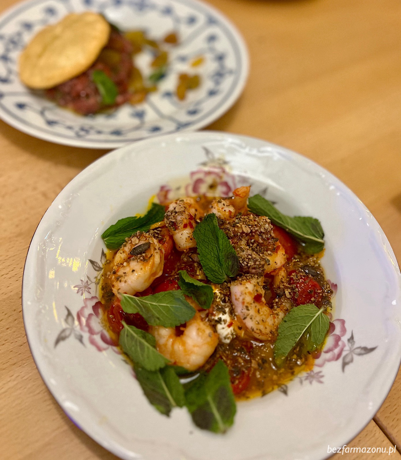 - labneh z konfitowanymi krewetkami i salsą z grillowanych oliwek z cytrusami (42 PLN) oraz