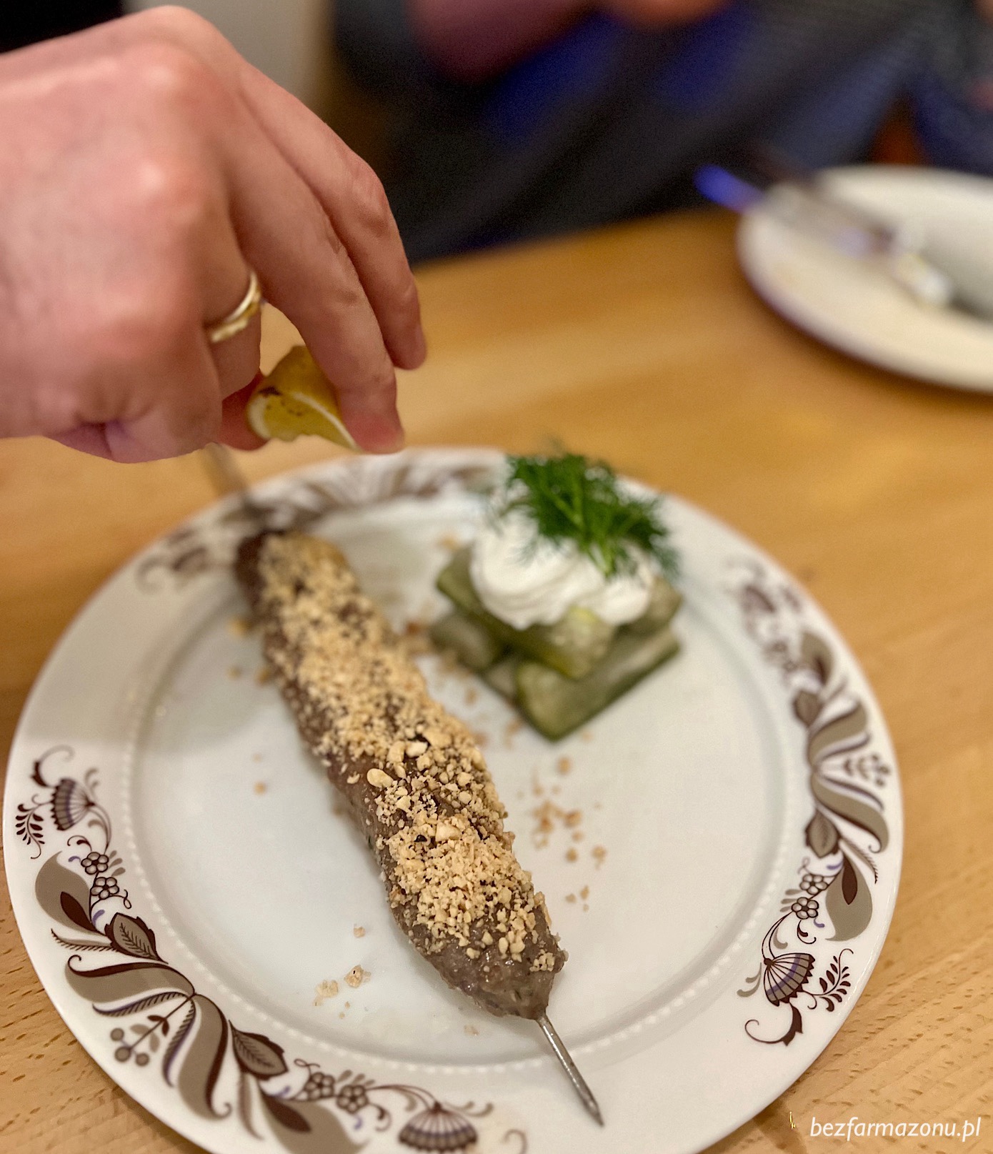 Barania kofta (44 PLN) z melasą w towarzystwie jogurtu i małosolnych z anyżem oceniona wzorowo głównie przez wzgląd na jej miękkość, soczystość oraz przemocny zapach.