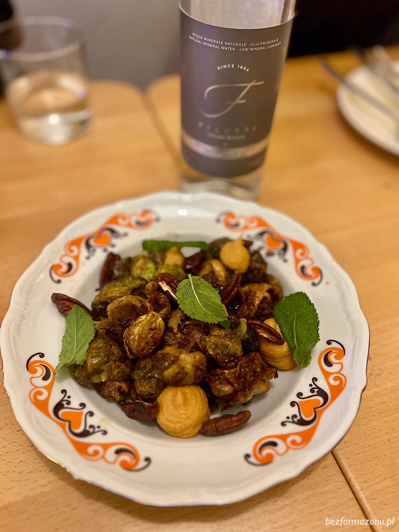 Daniem, które bez dwóch zdań zdobyło serca wszystkich były smażone brukselki ze słodką glazurą z cydru, orzechami pekan (zero goryczki) oraz hummusem z pieczonym czosnkiem (27 PLN). Takich brukselek nie jadłem nigdy w życiu – coś wspaniałego!