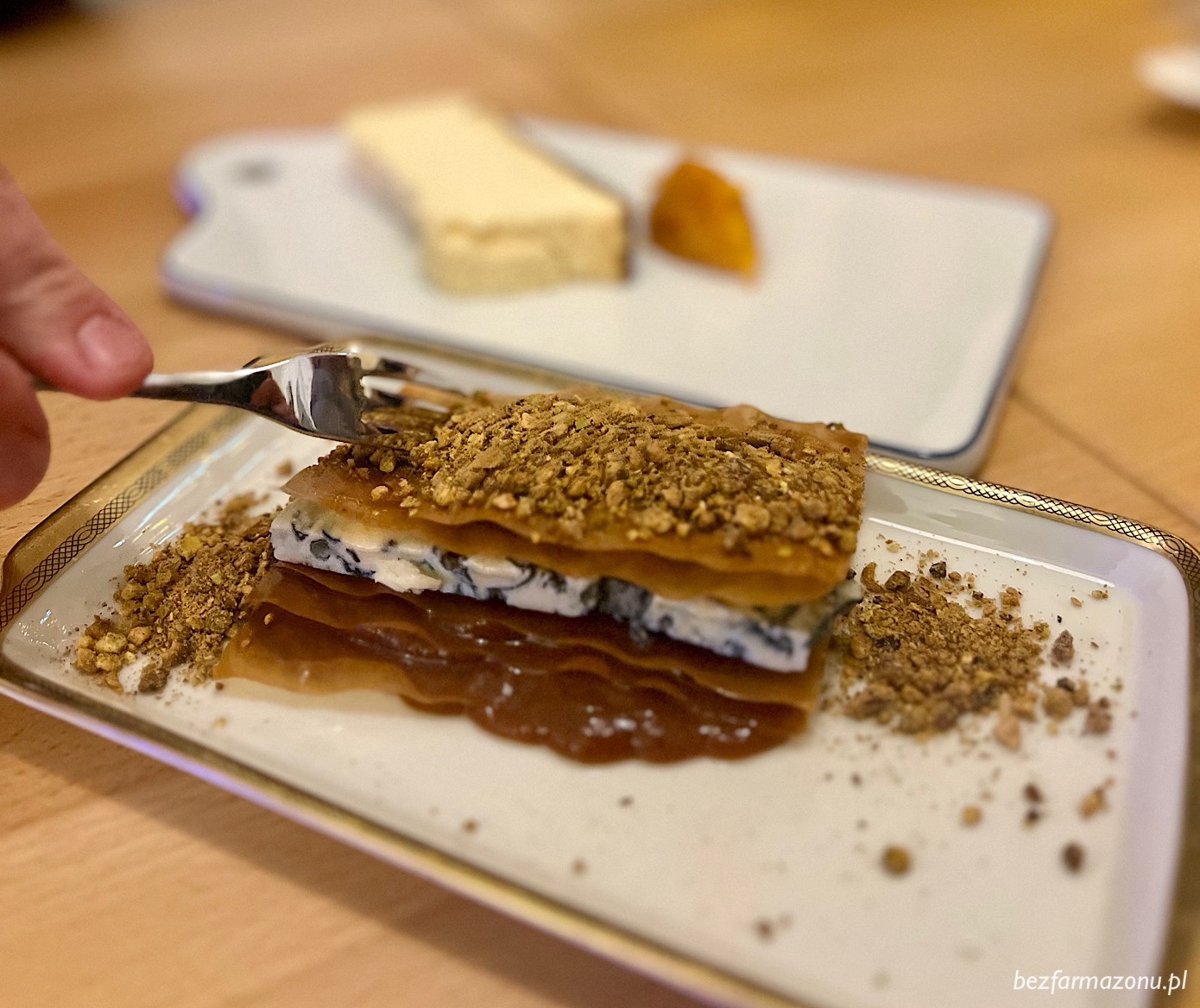 Pierwszy kontrowersyjny, bo kto to widział żeby pod ciastem filo z orzechowym crunchem (28 PLN) schować konkretny kawał mocnego i agresywnego pleśniowego sera, a obok dać słodki a’la dżem z fig w winie. Powiem Wam, że w tym szaleństwie jest metoda – to serio dobrze smakowało!