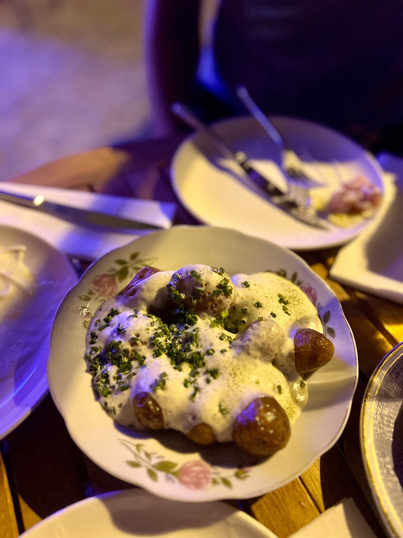 - ziemniaki z serem tallegio i szczypiorkiem (26 PLN).