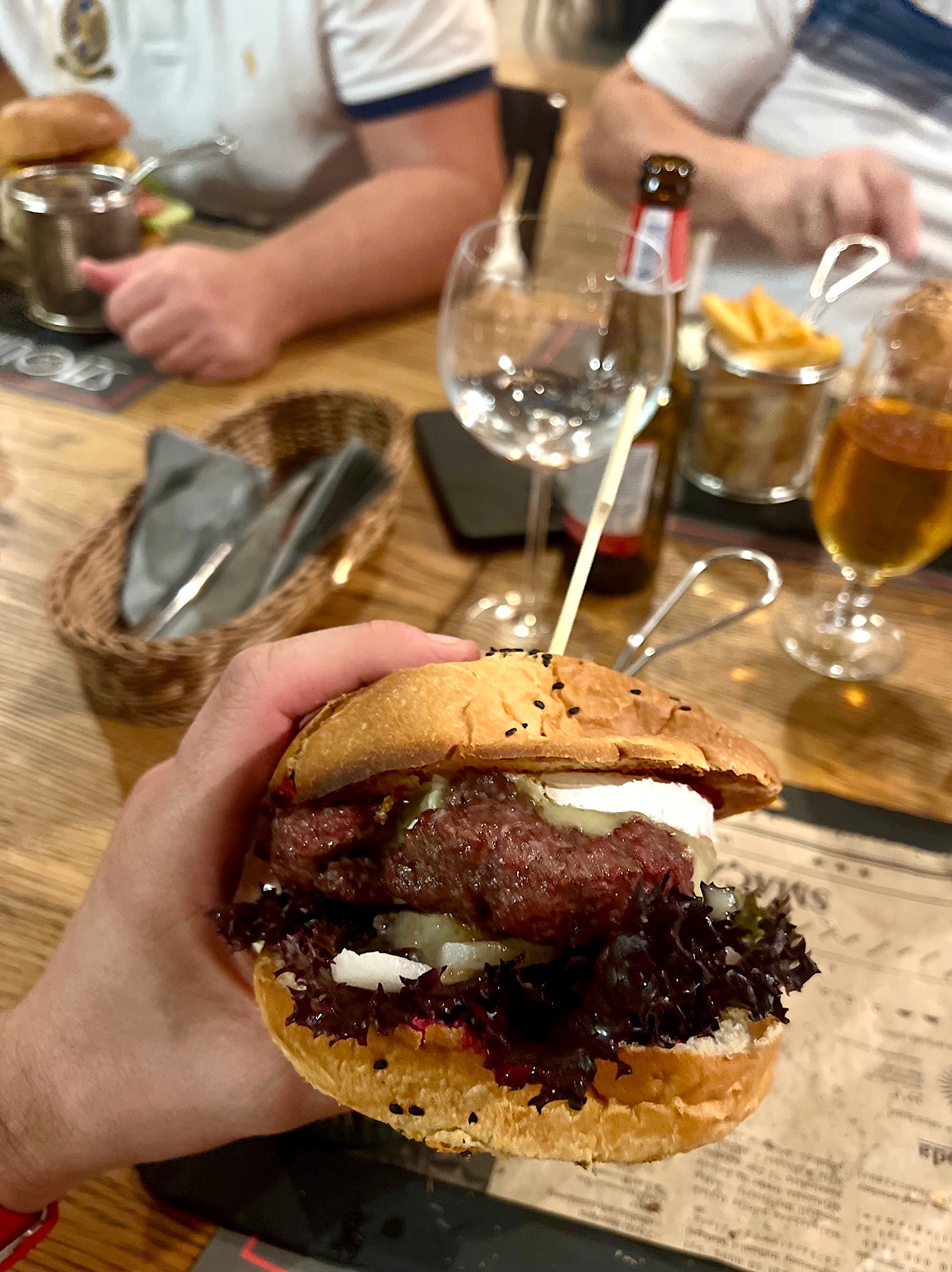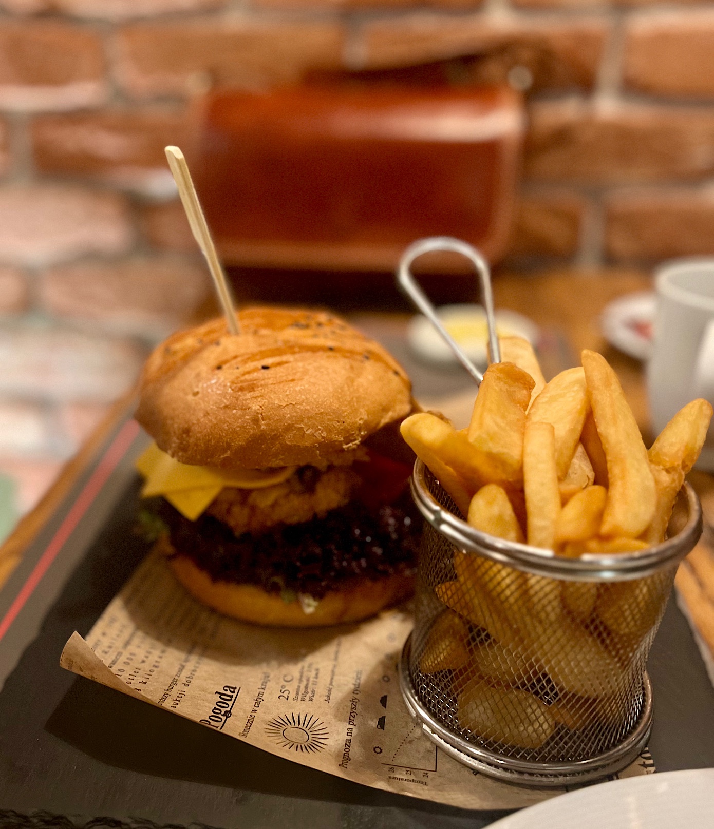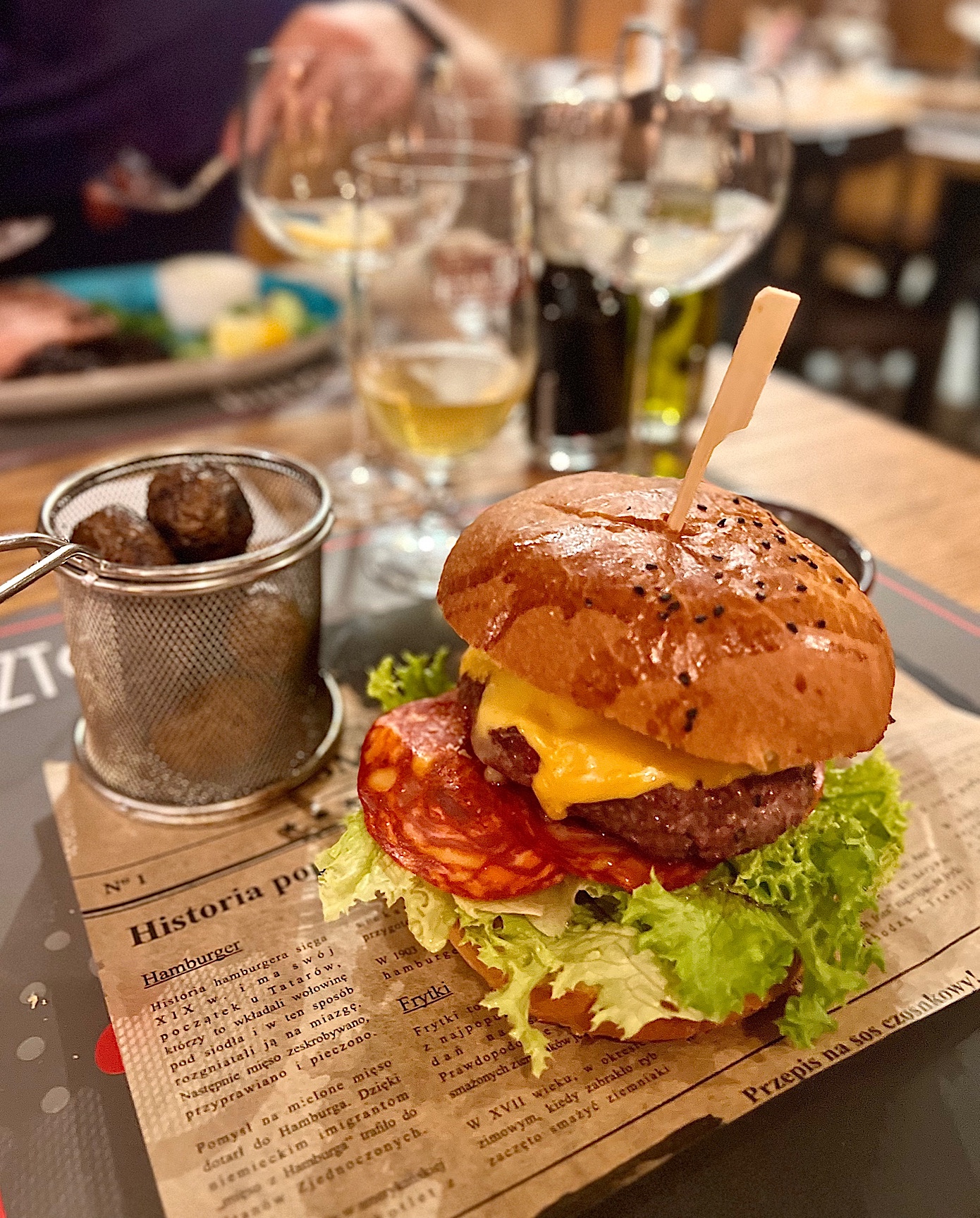 Kilkoro z nas w ramach dań głównych poszło w burgery, które podaje się wraz z frytkami oraz coleslawem. Nie było jednak żadnego problemu, aby w dwóch zamówieniach owe frytki wymienić na pachnące ogniem ziemniaczki. Perfekcyjne! Bardzo, ale to bardzo je Wam polecam.