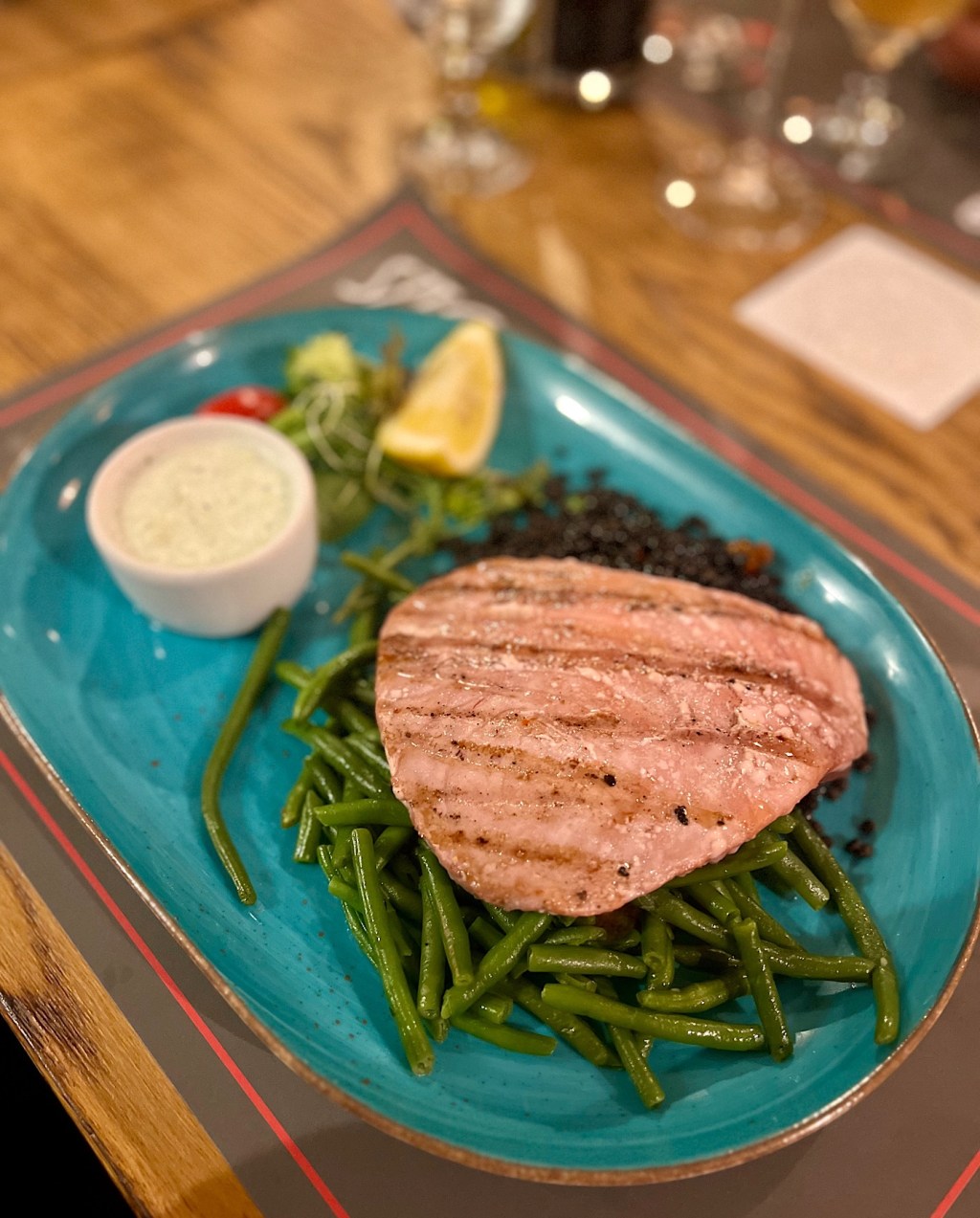 Łosoś grillowany ze szparagami i sosem berneńskim (40 PLN) podobnie jak stek z tuńczyka z czarną soczewicą, fasolką szparagową oraz tzatzikami (62 PLN) pachniały ogniem aż miło. Zarówno K. jak i Sz. dania pochwalili.
