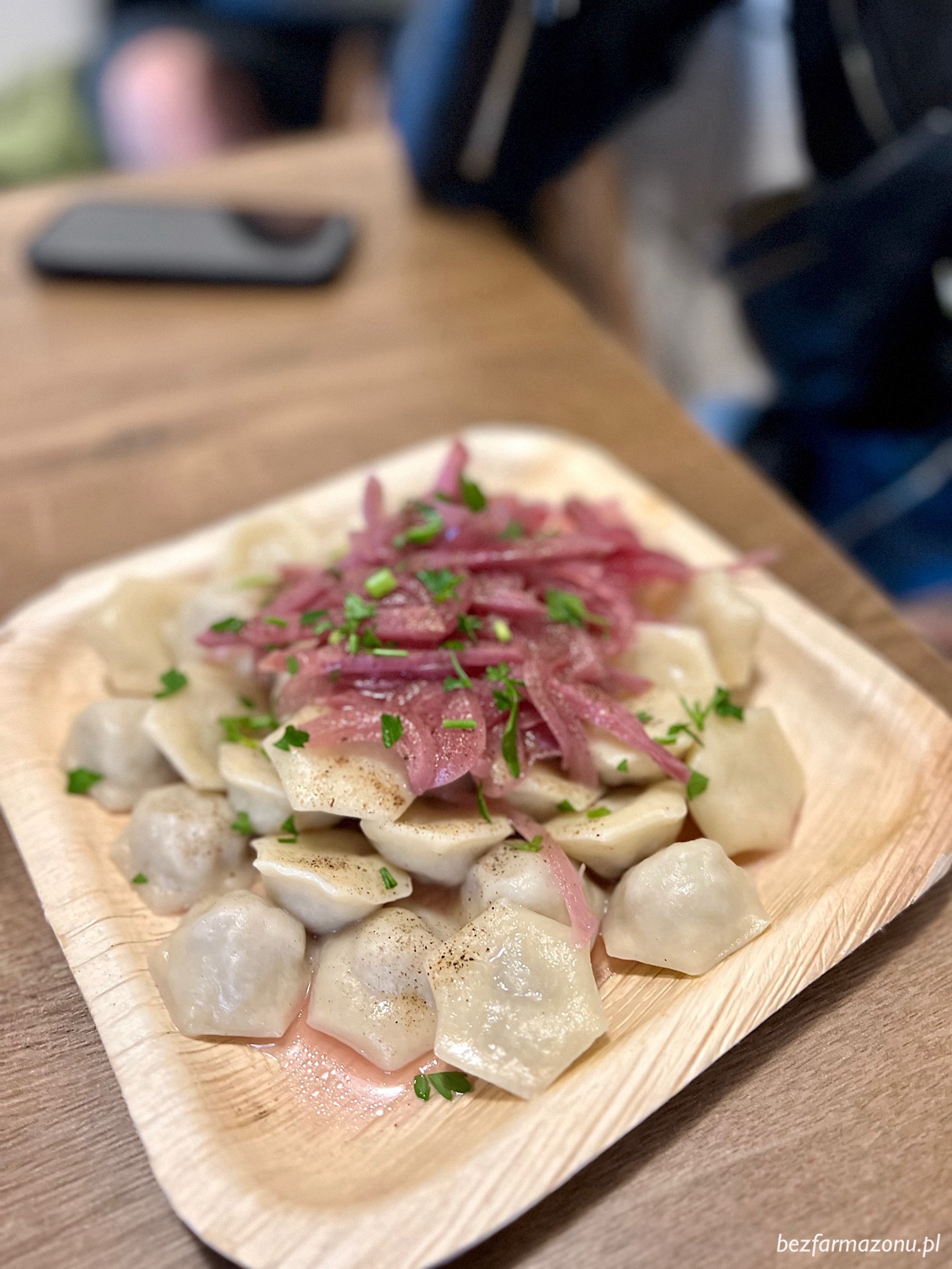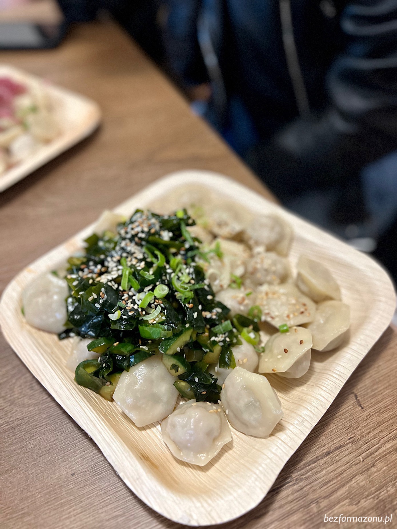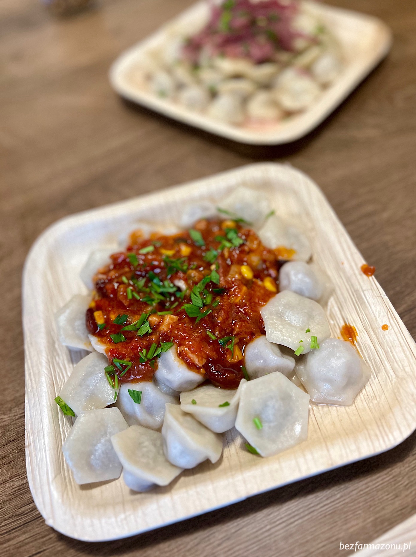 Ciasto jest zwarte, a treści dobrze doprawione. Strzałem w dziesiątkę są te kolorowe sałatki. Rześkie i charakterne pasują idealnie do tego co pielmieni kryją w swoich wnętrzach.