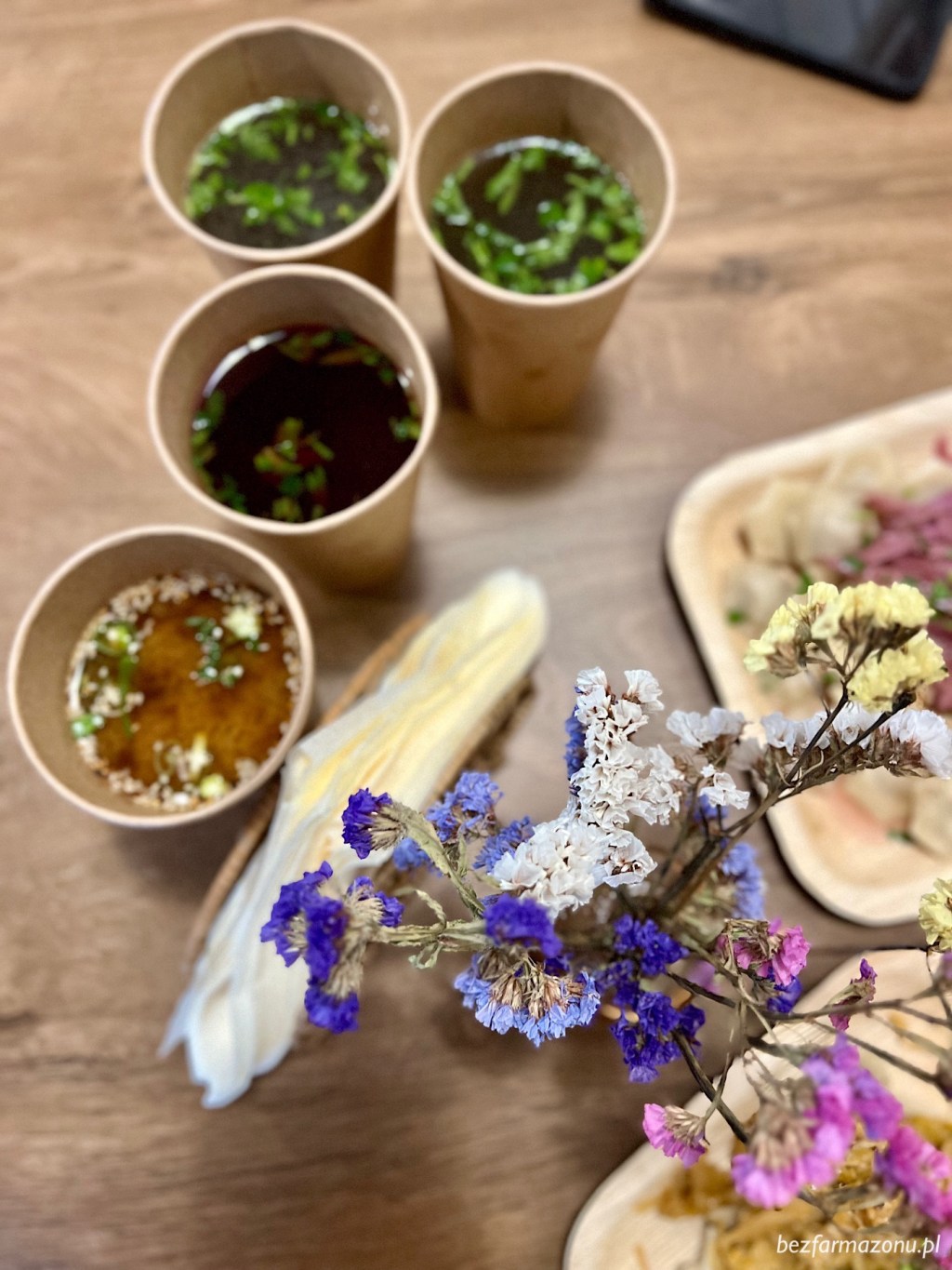 Na zimniejsze dni polecają się 300 ml zupy w kubkach (12 PLN). Rosół i czerwony barszcz to nic odkrywczego, ale miso bardzo robi robotę.