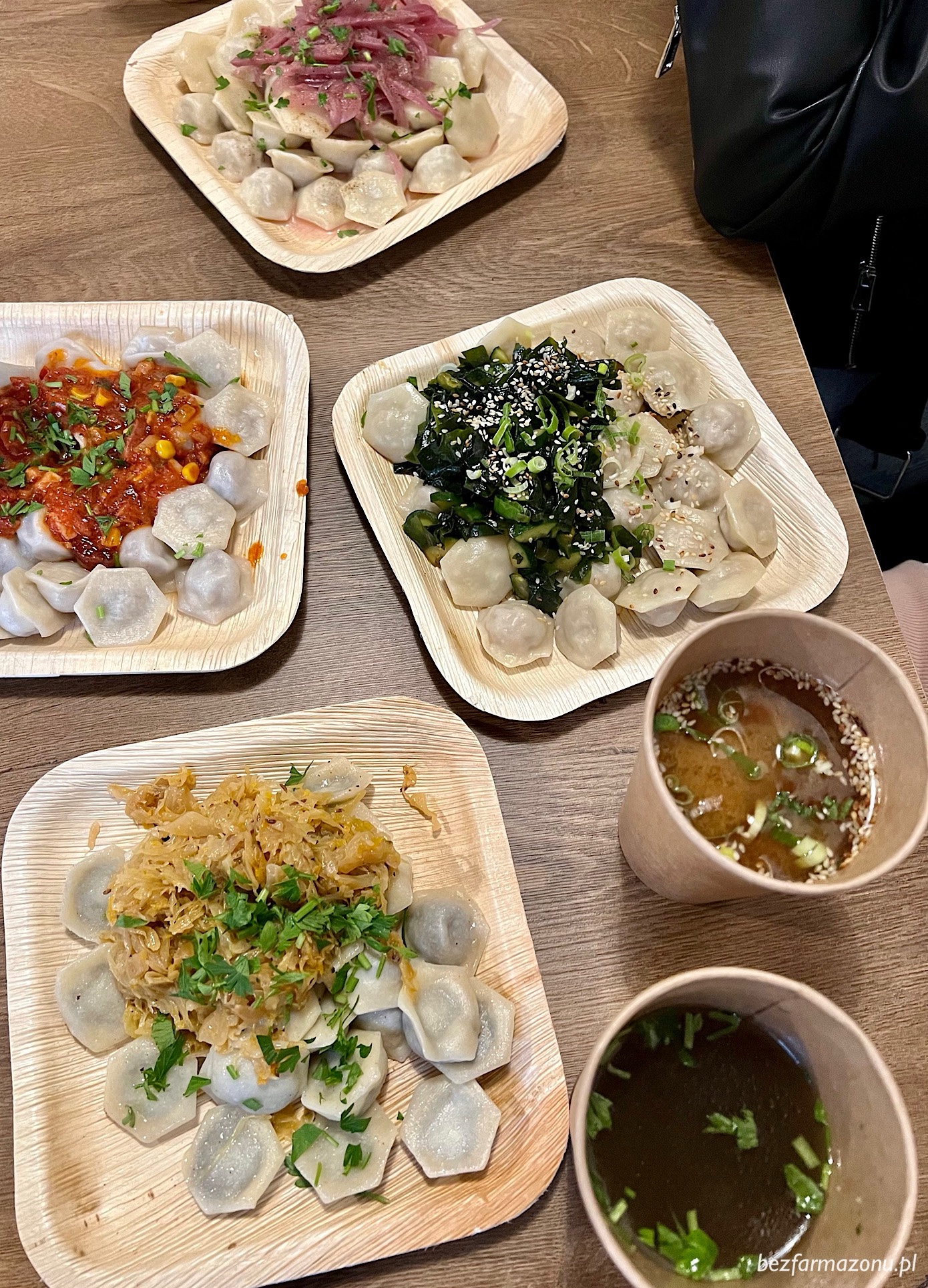 Ciasto jest zwarte, a treści dobrze doprawione. Strzałem w dziesiątkę są te kolorowe sałatki. Rześkie i charakterne pasują idealnie do tego co pielmieni kryją w swoich wnętrzach.