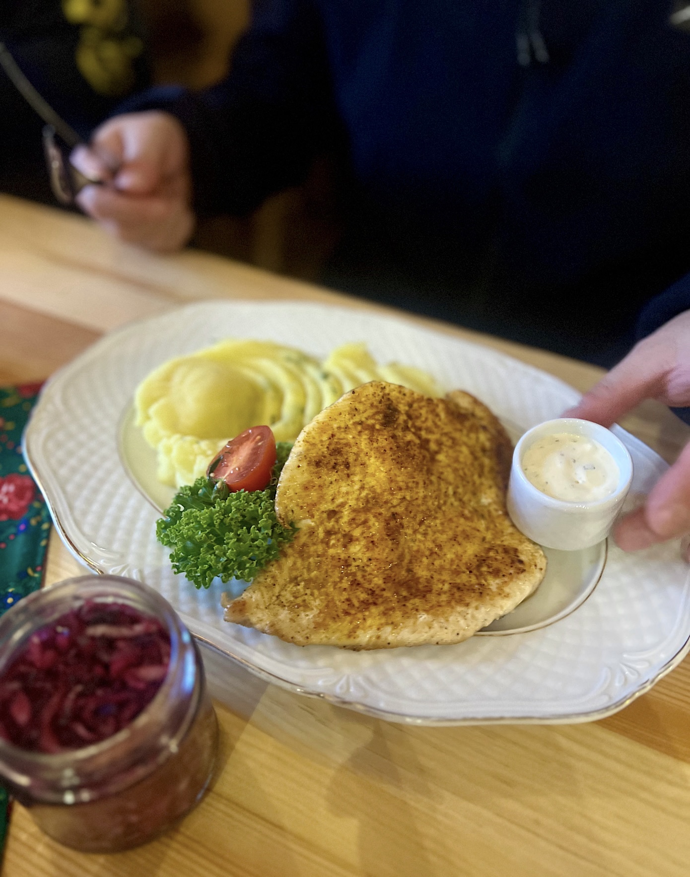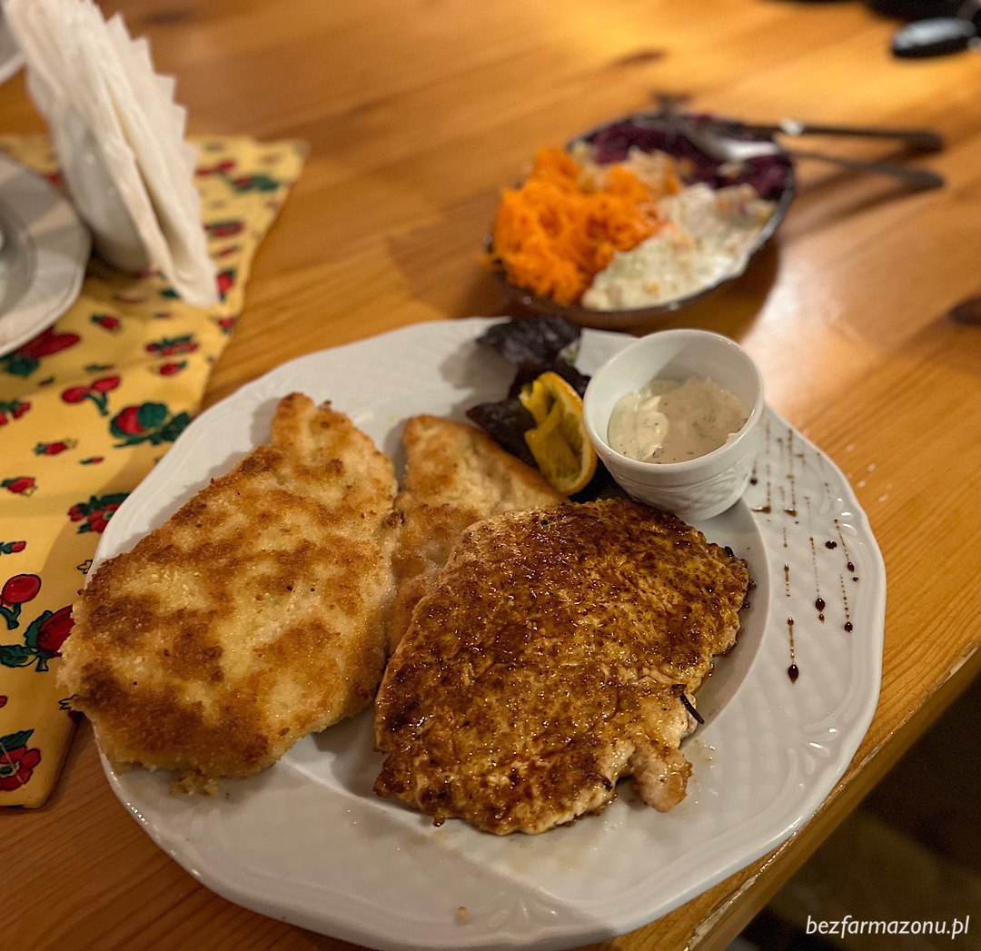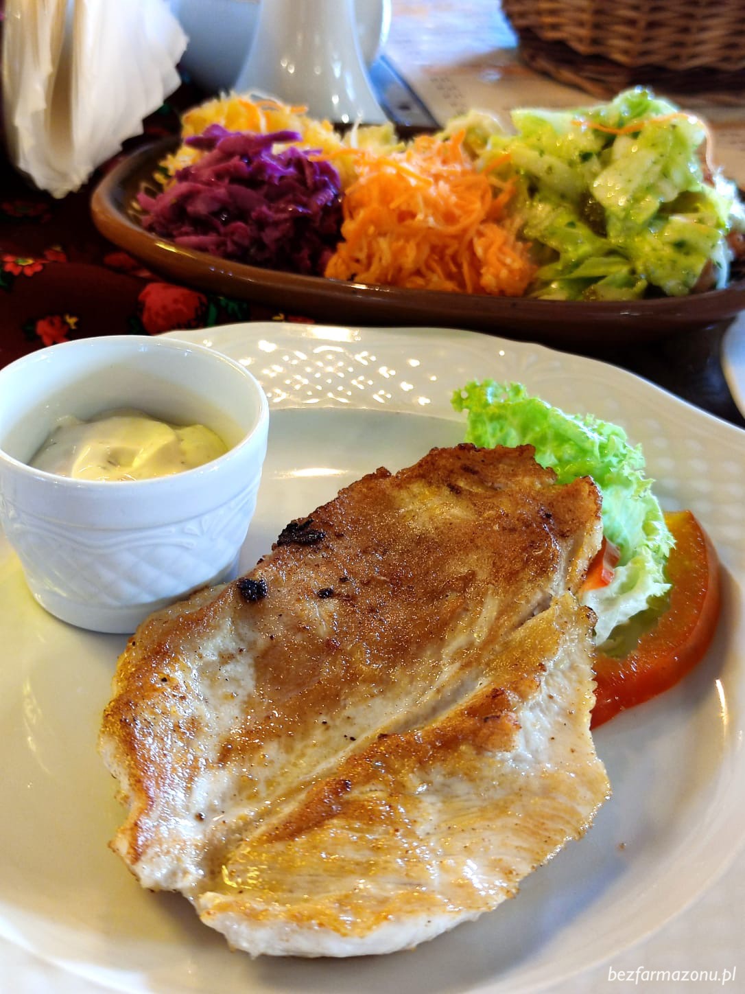 Tydzień później wracając ze snowboardu odwiedziliśmy karczmę wraz z B. i F. Ja poprosiłem o wersję bezpieczną i wielokrotnie przeze mnie sprawdzaną, ale w opcji dla bardzo głodnego człowieka czyli panierowaną i drugą grillowaną pierś kurczaka (każda za 14 PLN).